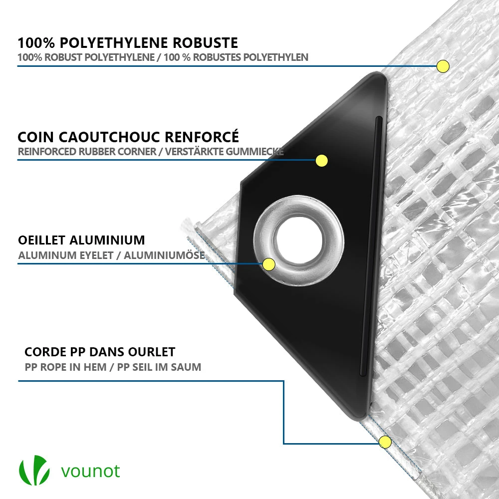 CARACTÉRISTIQUE : • Matériel : PE (polyéthylène tissé de tissu) TAILLES RÉELLES FINALES : Notre bâche est conforme à la taille indiquée de la description qui est donc la taille finie et incluant les replis. IMPORTANT : Les livraisons se font en France métropolitaine à l’exception des îles qui ne sont pas reliées au continent par un pont (Corse, Ile d’Yeux etc.) et des DOM-TOM.