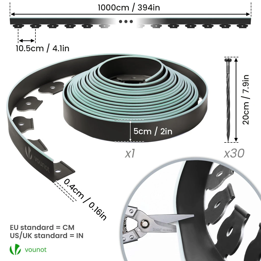 - Notre bordure de pelouse est équipée des 30 piquets de fixation en forme d’hélice afin de mieux se fixer au sol. De plus, la longueur de 20cm assure une meilleure tenue dans le sol.
