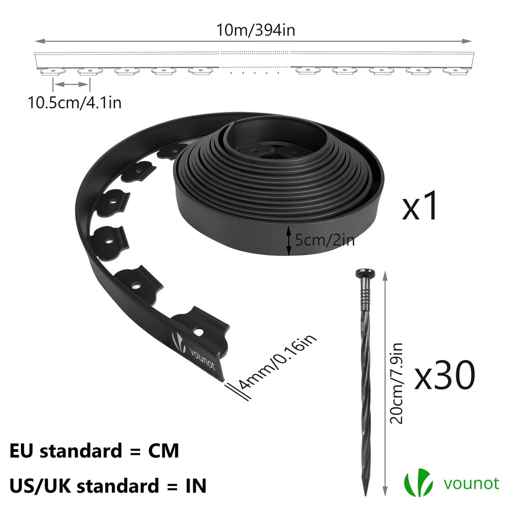 Bordure de Jardin en Plastique Matière : PE, Matériaux recyclés Hauteur : 5cm Modèles diponibles : 10M gris / 10M noir / 10M vert / 10M marron / 20M gris / 20M noir / 20M vert / 20M marron |