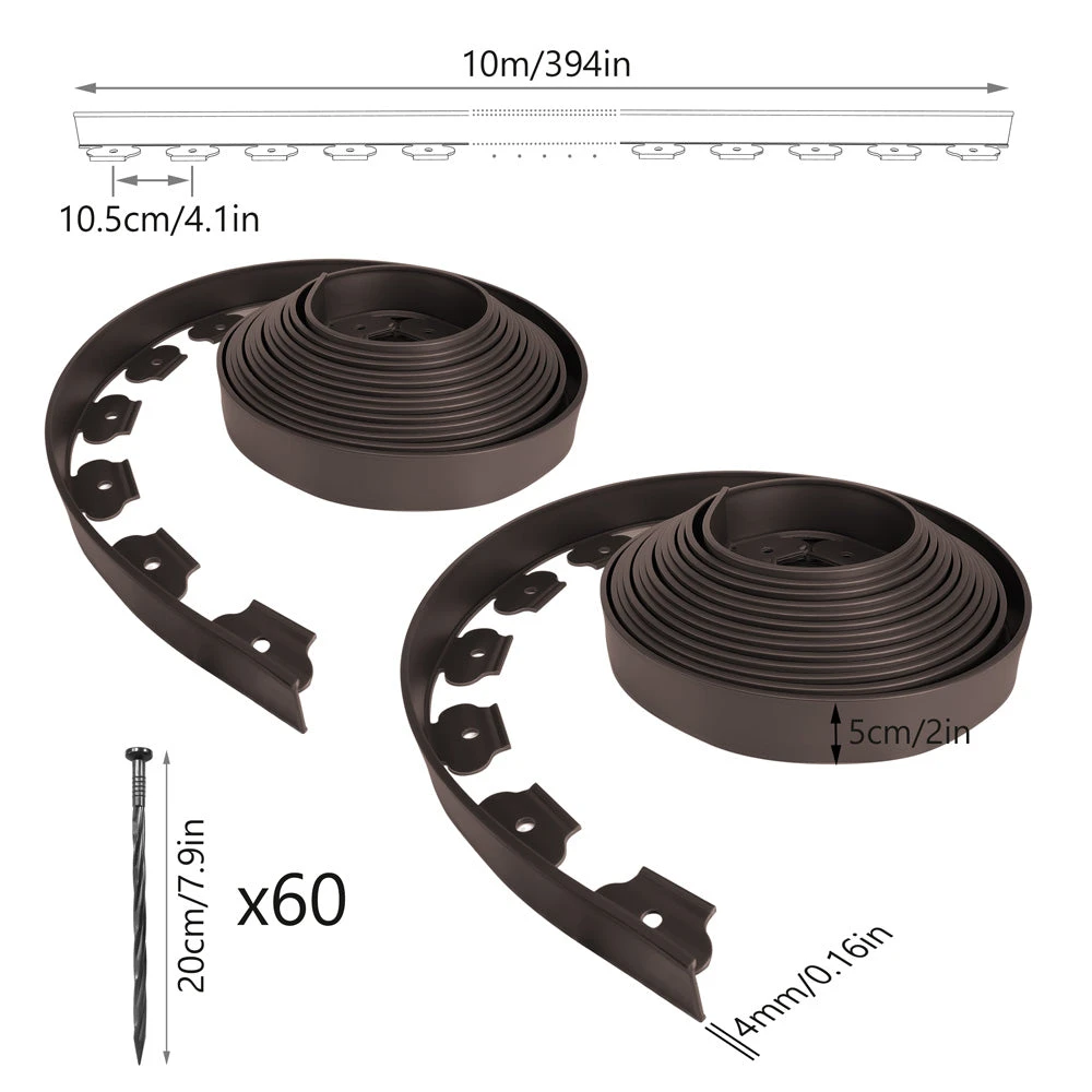 Bordure de Jardin en Plastique Matière : PE, Matériaux recyclés Hauteur : 5cm Modèles diponibles : 10M gris / 10M noir / 10M vert / 10M marron / 20M gris / 20M noir / 20M vert / 20M marron |