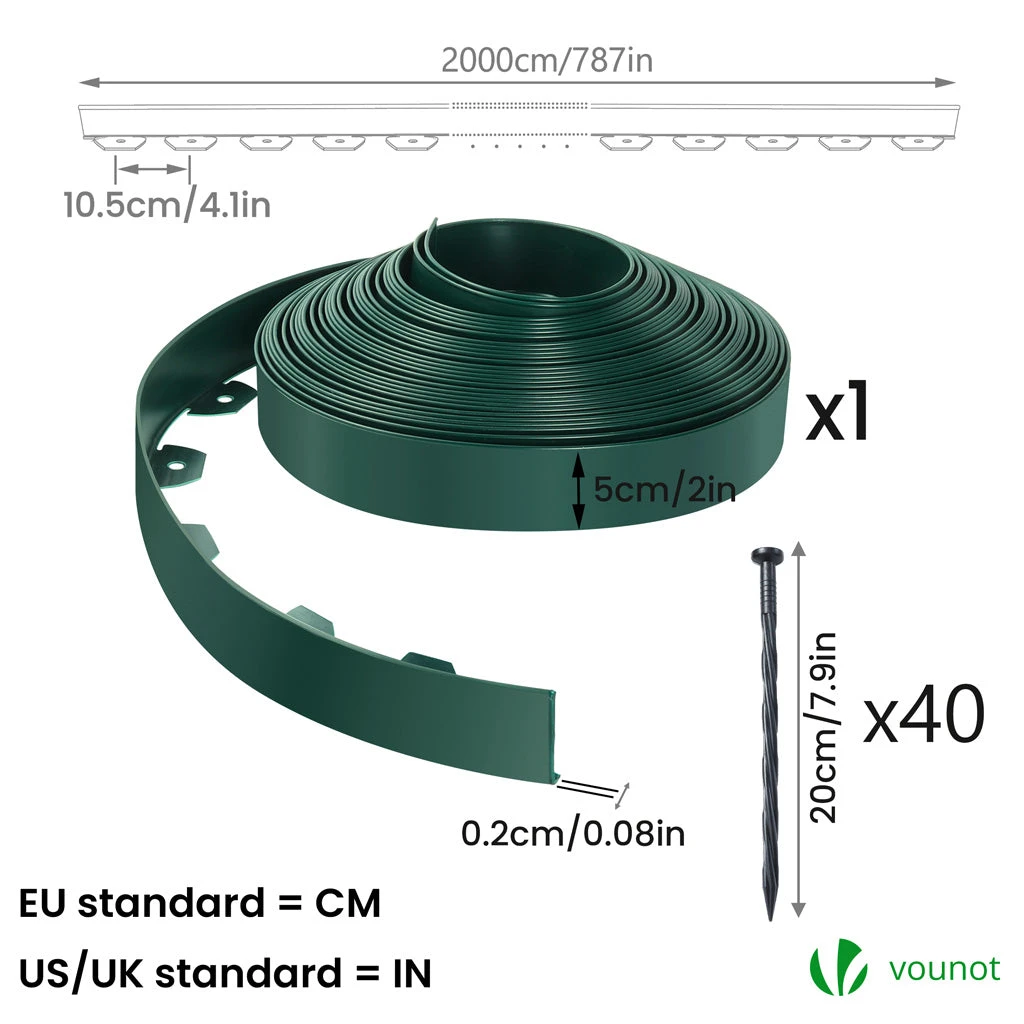 CARACTÉRISTIQUES • Matériaux : PVC, matériaux recyclés • Longueur disponible : 20M, 2*20M • Hauteur : 50mm • Épaisseur : 2mm • Longueur du piquet : 20cm |