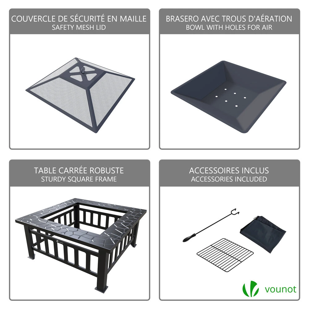 Brasero de qualité et complet Le matériau métallique résiste non seulement aux températures élevées, mais également à la rouille, ce qui garantit une utilisation à long terme. Tous les accessoires nécessaires sont inclus dans le colis. Un couvercle en maille pour éviter de brûler les braises, un poker pour enlever le couvercle en filet et déplacer les bûches, une housse de protection en tissus imperméable Oxford pour protéger le brasero. Brasero Extérieur Multi Usages Ce foyer extérieur est l’endroit idéal pour se détendre et profiter de la chaleur. Avec une grande table entourée qui vous protège des brûlures, vous pouvez vous asseoir près du feu sans craindre d’étincelles ou de cendres. Avec une vue à 360 degrés du feu, peu importe où vous êtes assis, vous aurez une vue magnifique sur les flammes et profitez de la chaleur.