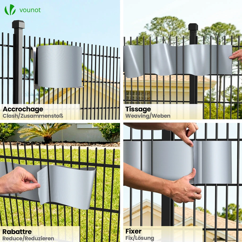 CARACTÉRISTIQUE • Couleurs disponibles : Gris clair, Antracite, Noir, Vert • Matériel : PVC • Hauteur : 19cm • Longeur : 140m • Inclus clips de montage : 80pcs Brise-vue de notre marque VOUNOT en PVC 450 g/m², résistant aux UV, à l’eau et aux intempéries. Facile à installer et adapté aux clôtures rigides, il protège efficacement votre intimité tout en apportant une touche harmonieuse à votre espace extérieur. Pourquoi choisir notre produit ?