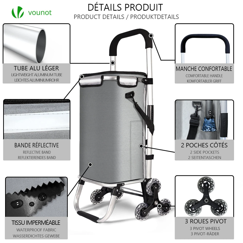 | Chariot de courses aluminium 6 roues avec sac imperméable noir | Chariot de courses aluminium 6 roues avec sac isotherme noir | Chariot de courses aluminium 6 roues avec sac imperméable gris | Chariot de courses aluminium 6 roues avec sac isotherme gris |