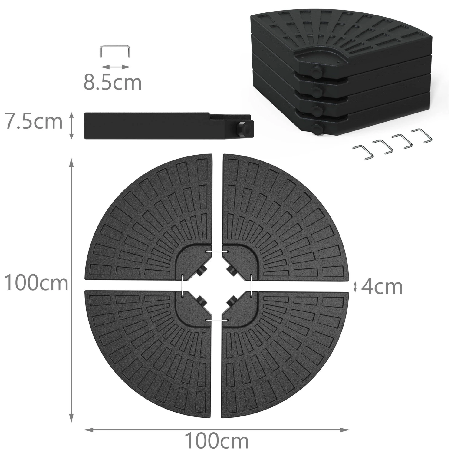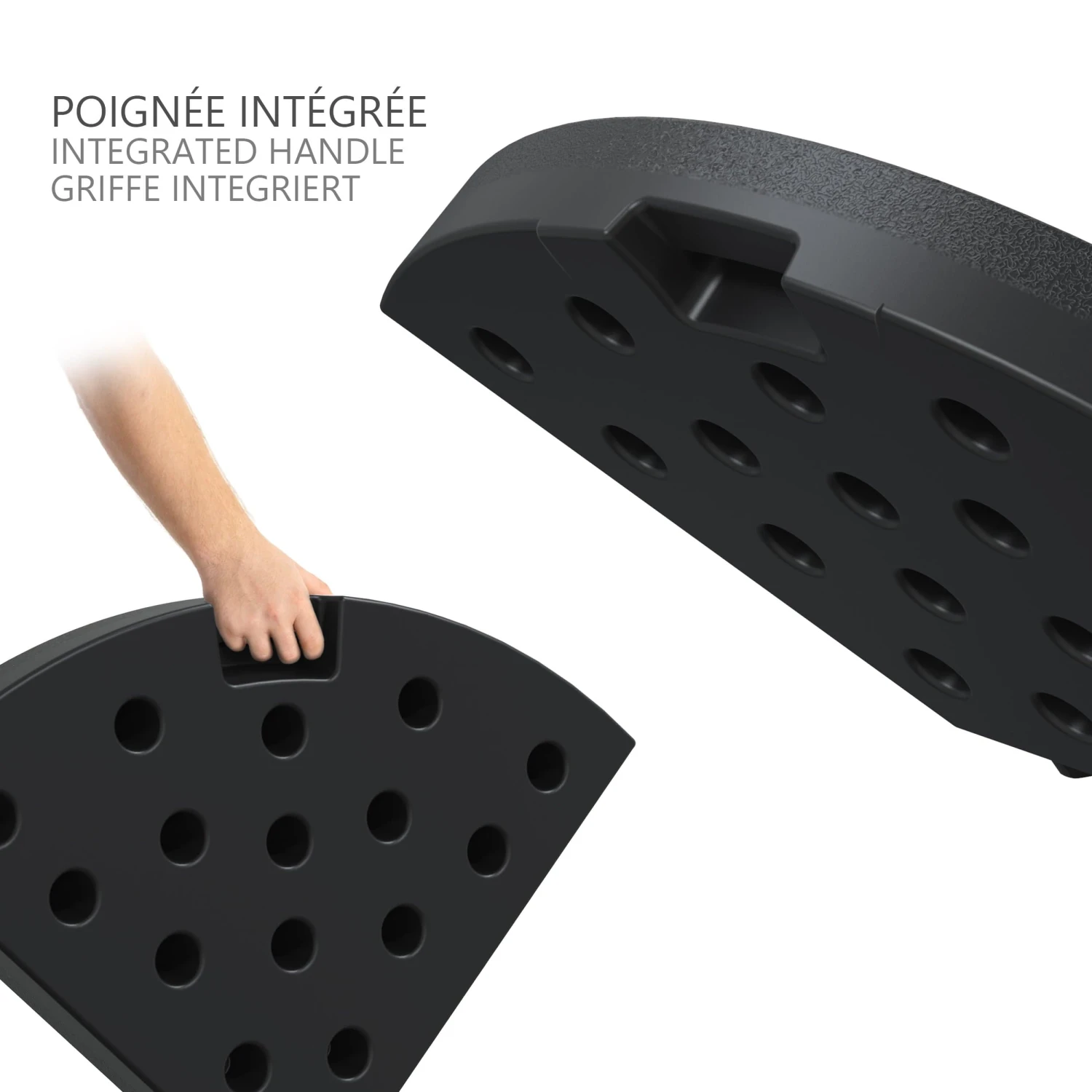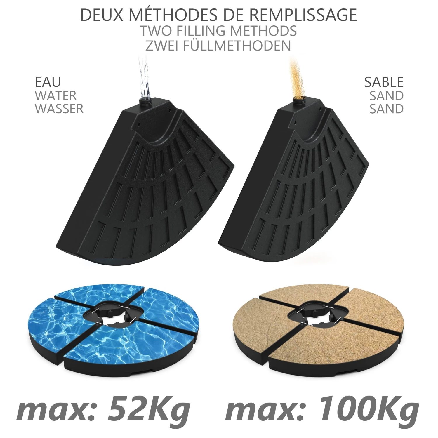 GRANDE CAPACITÉ Les 4 dalles remplies d’eau font 52L ou remplies de sable, elles peuvent peser jusqu’à 100kg et maintenir une grande stabilité. UTILISATION PRATIQUE Il y a 4 poignées au bas de la base pour vous aider à la déplacer ou à la ranger facilement même lorsqu’elle est remplie d’eau et de sable. Dalle pour les pied en croix