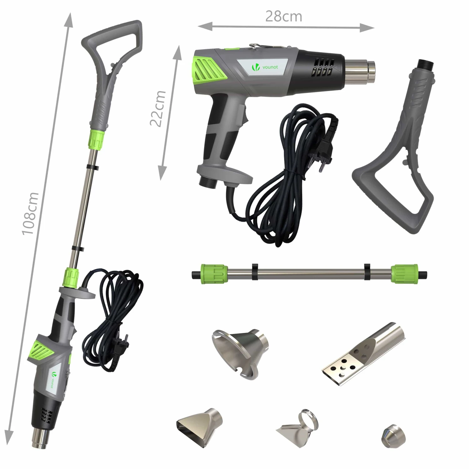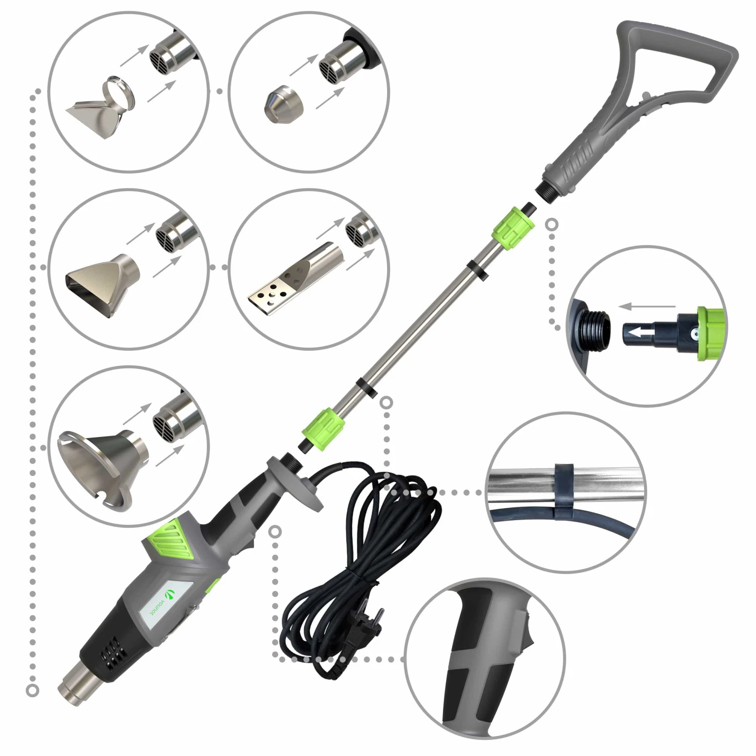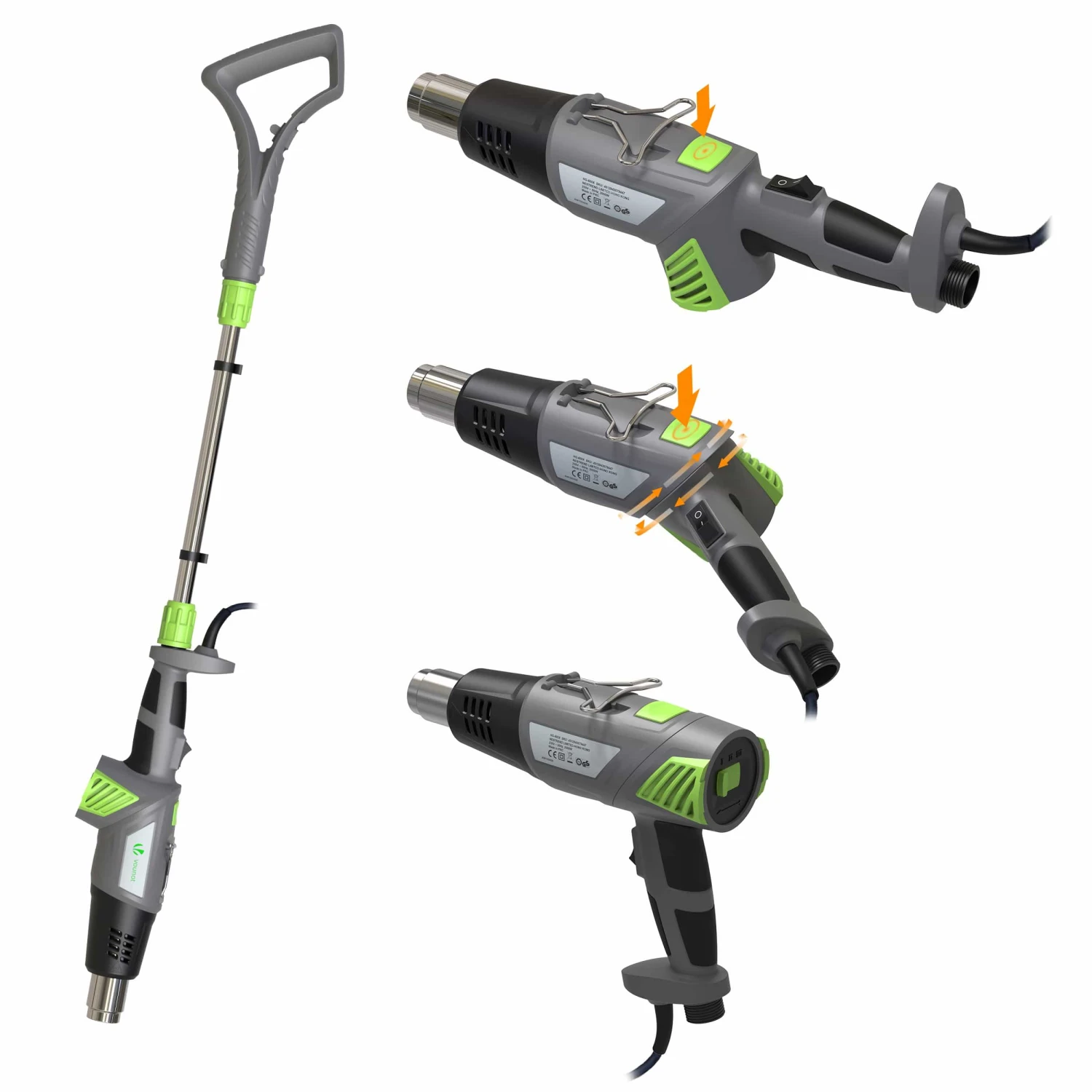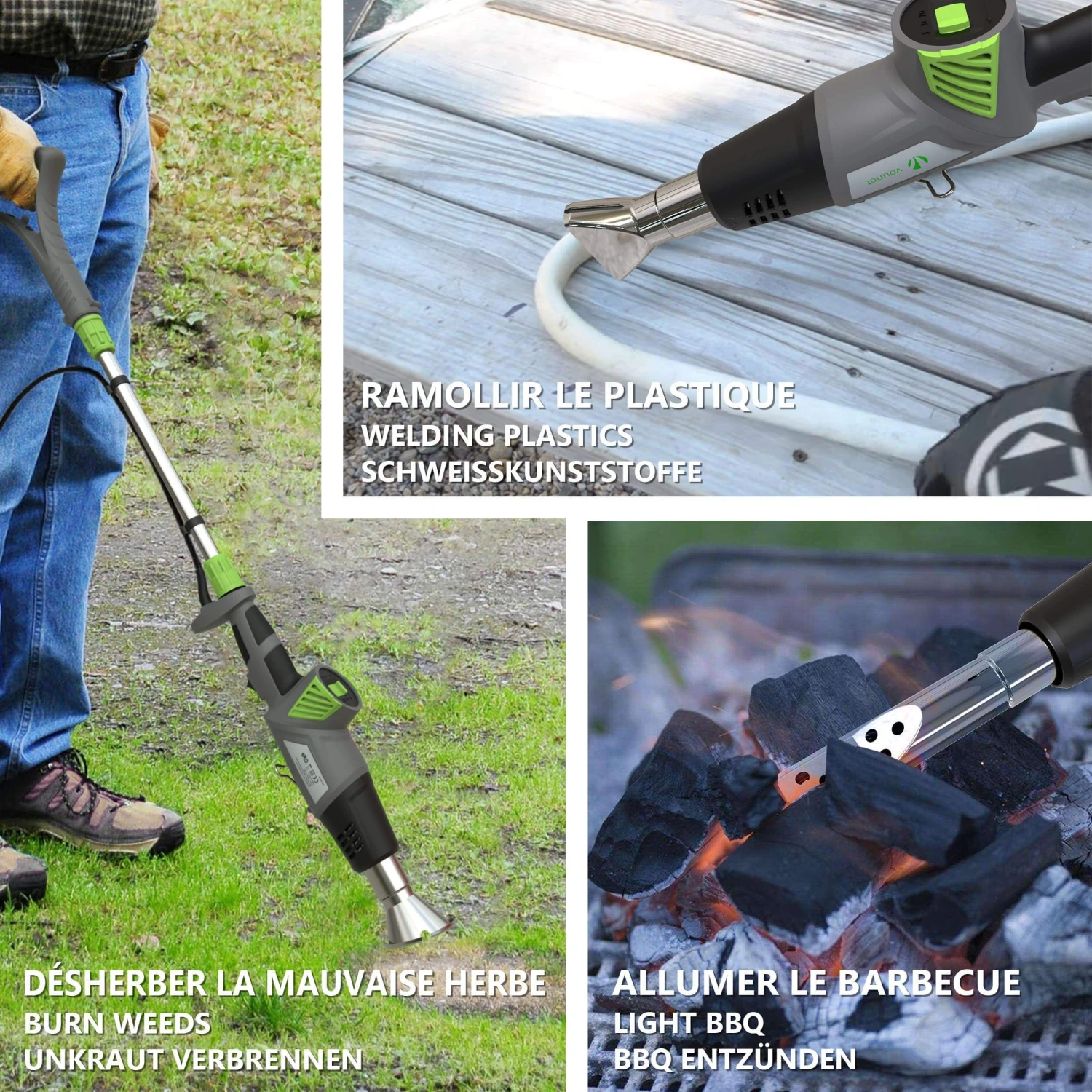 CONSEILS : Pour un meilleur résultat, les mauvaises herbes doivent être totalement recouvertes par la tête de précision. Ne pas rester trop longtemps sur un endroit afin d’éviter de brûler un petit peu les alentours de la mauvaise herbe. Désherbeur Transformable Notre désherbeur 5 en 1 peut être utilisé comme un pistolet à air chaud. Il vous suffit d’appuyer sur le bouton de l’appareil et de tourner sa poignée. En quelques secondes, vous obtiendrez un pistolet thermique qui est plus pratique pour des travaux. ATTENTION : Veuillez ne pas garder le pistolet thermique au même endroit trop longtemps. Température Réglable Avec notre désherbeur, vous avez 3 niveaux de température à choisir selon vos besoins. Conseil d’utilisation :