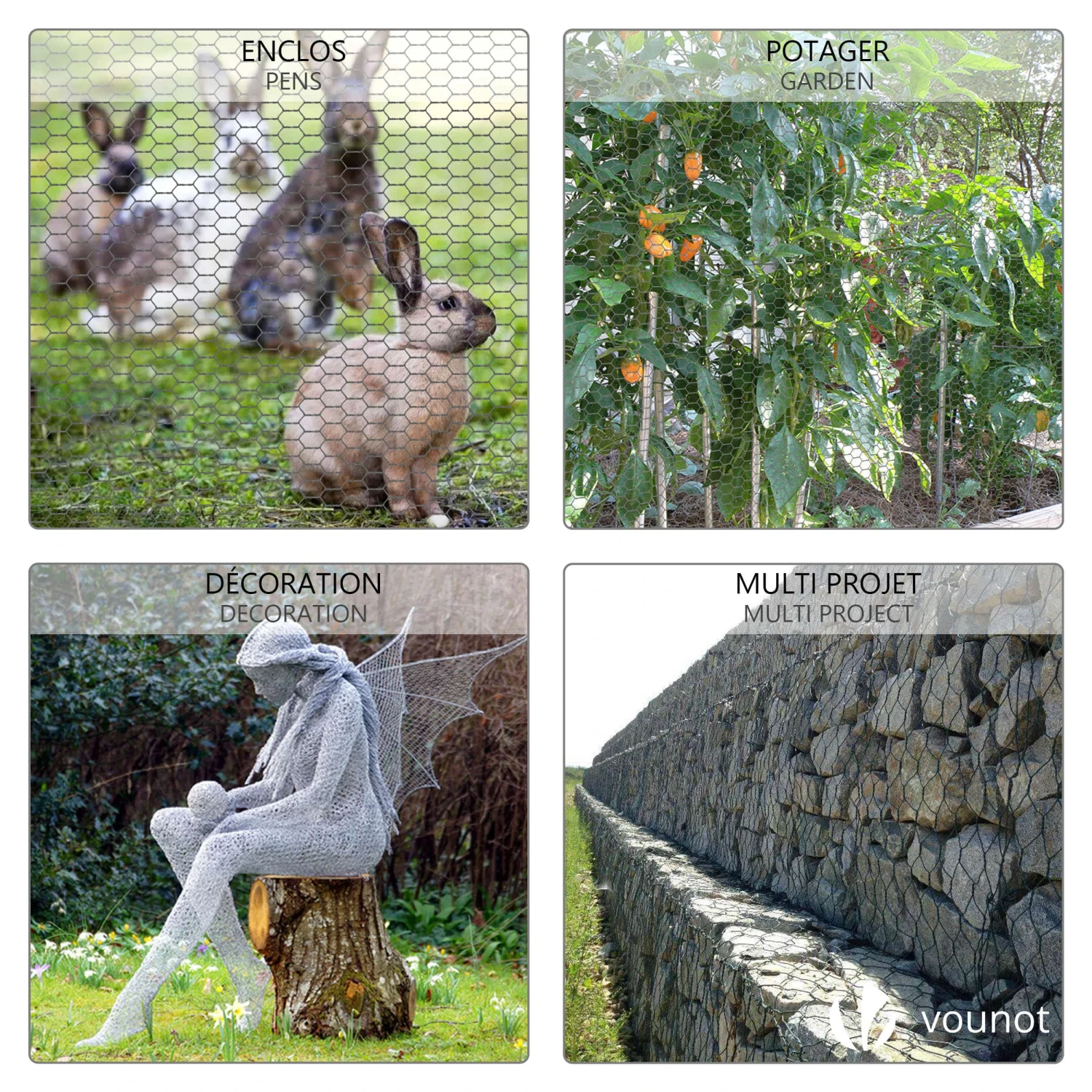 NE ROUILLE PAS. La surface de notre grillage hexagonal est recouverte d’un revêtement PVC. Cela en fait une utilisation à long terme et ne rouille pas et ne se déforme pas. Cette clôture peut être coupée à l’aide d’une paire de ciseaux selon les besoins et pliér dans la forme souhaitée.