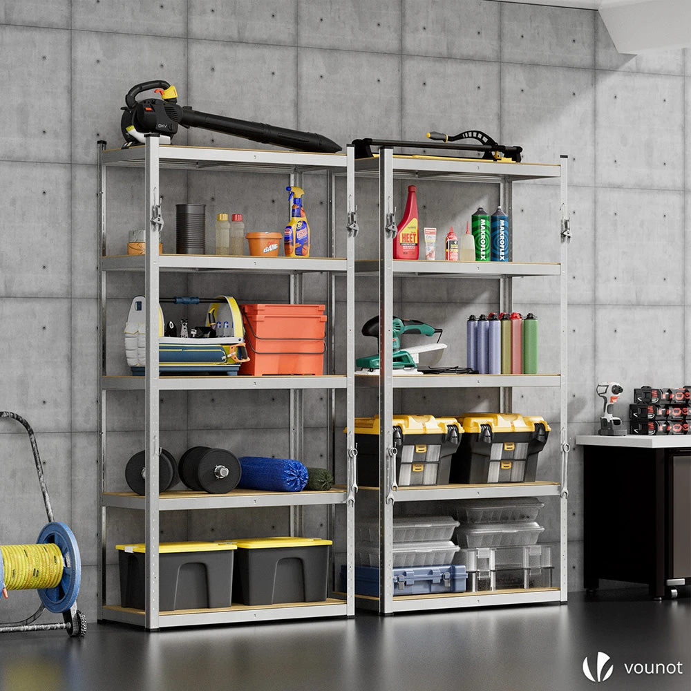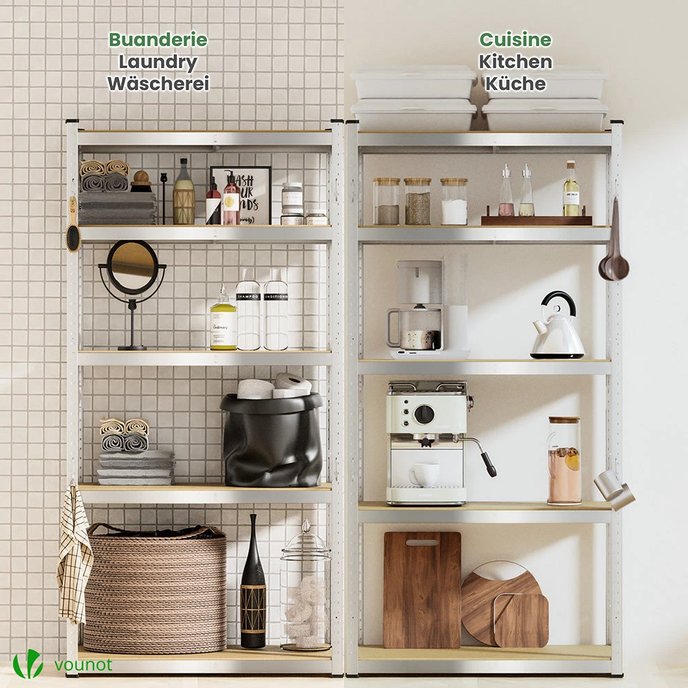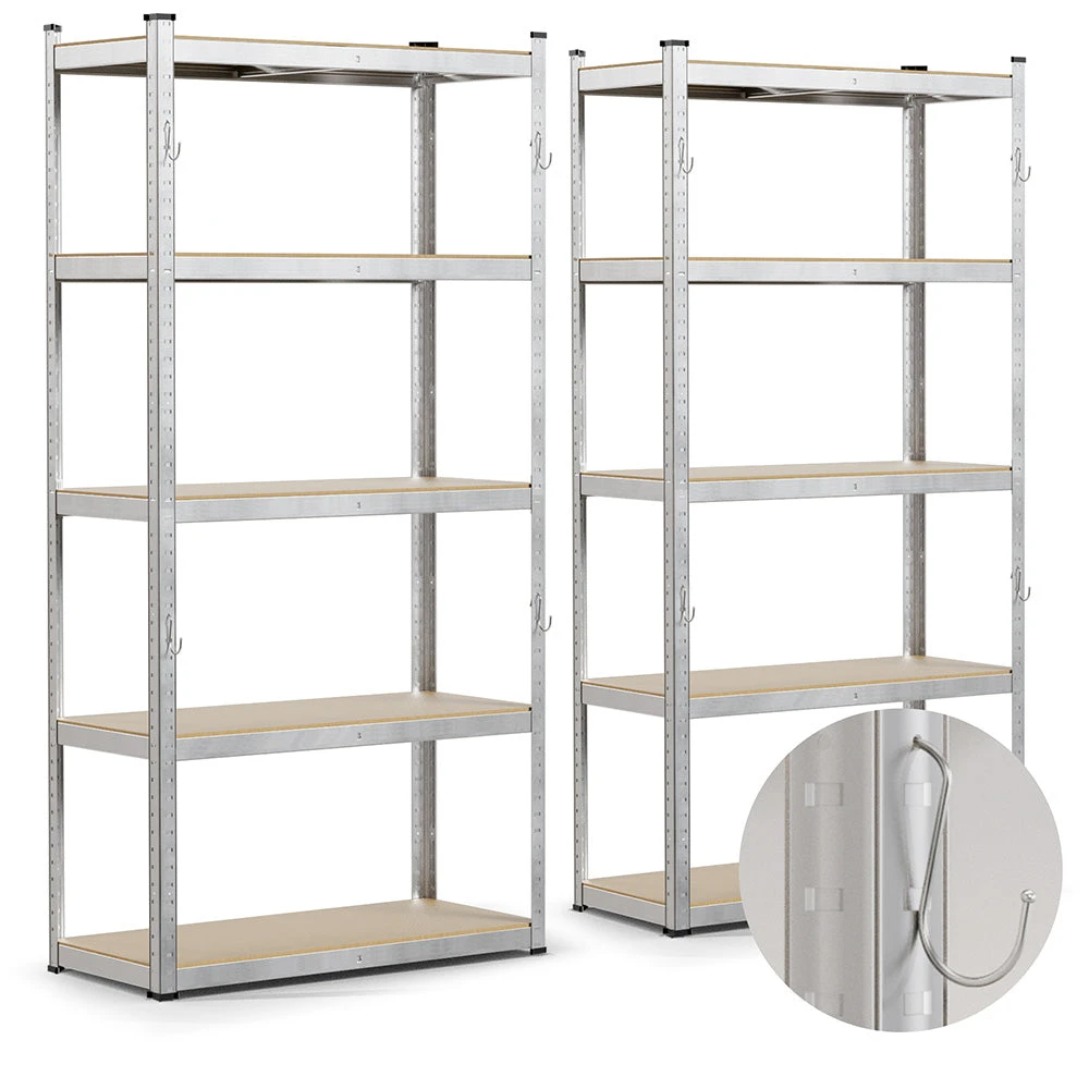 | Lot de 2 étagères de rangement charge lourde | Lot de 2 étagères de rangement renforcées charge extra lourde | Lot de 2 étagères de rangement avec crochets charge lourde |