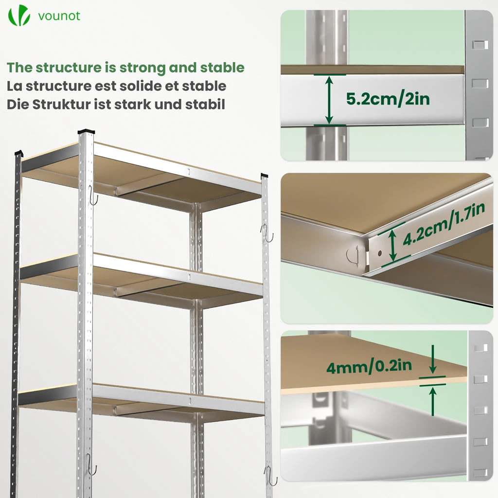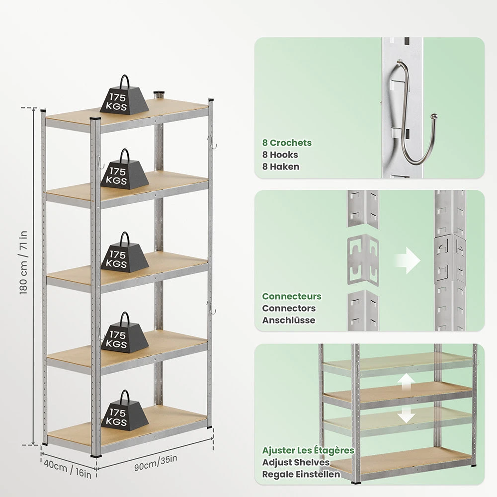 Avec sa structure en acier galvanisé et ses plateaux MDF, cette étagère offre une capacité de charge maximum de 875 kg, tout en permettant une personnalisation facile grâce à 8 crochets et son système de reconfiguration sans outils.