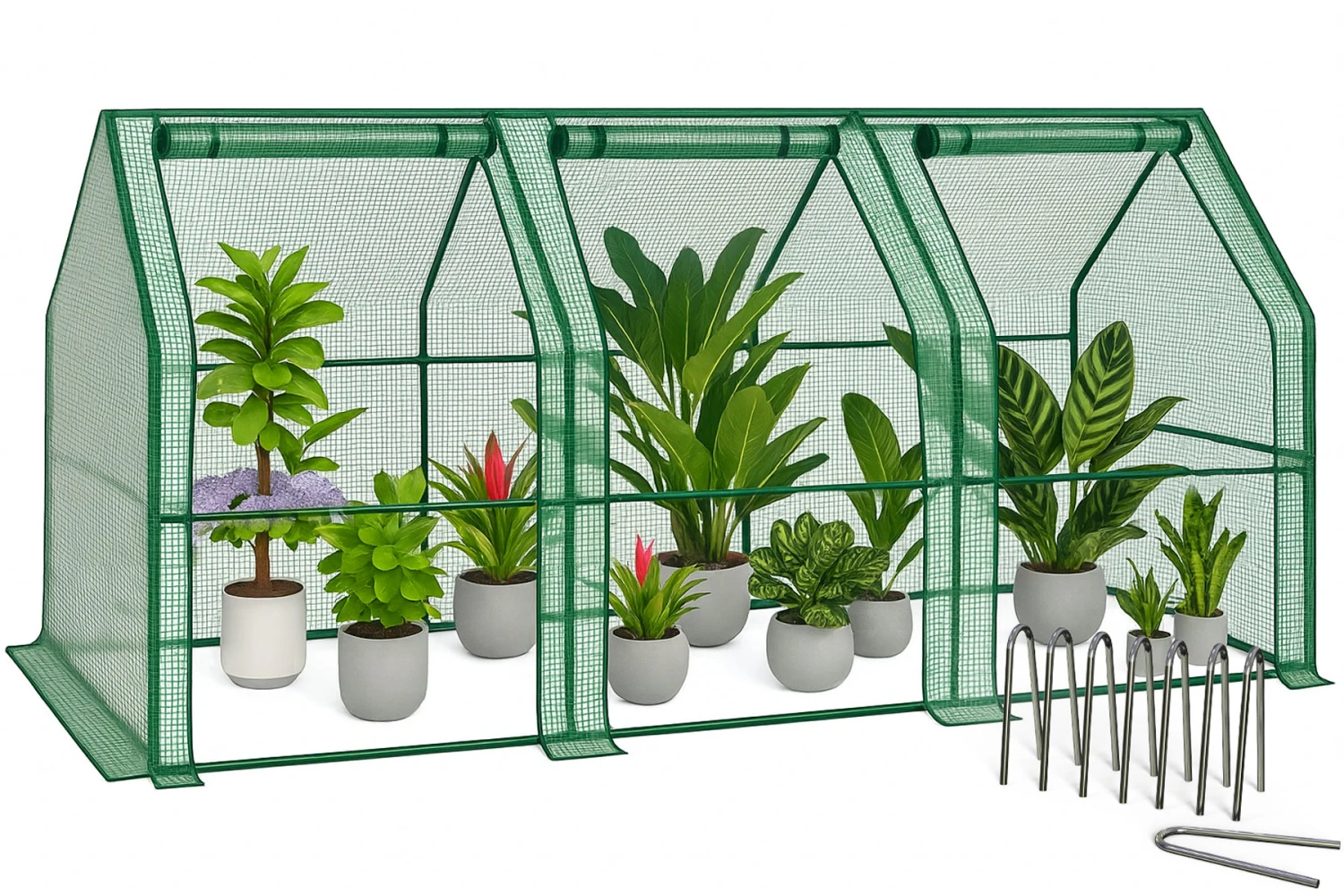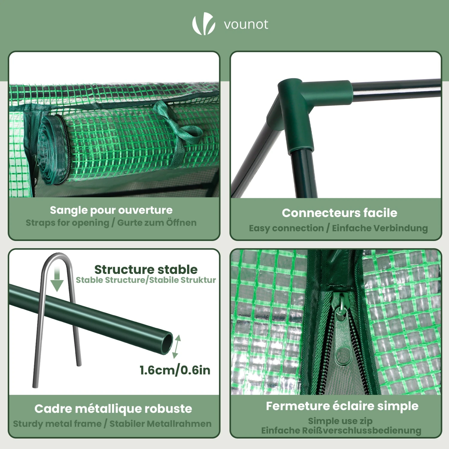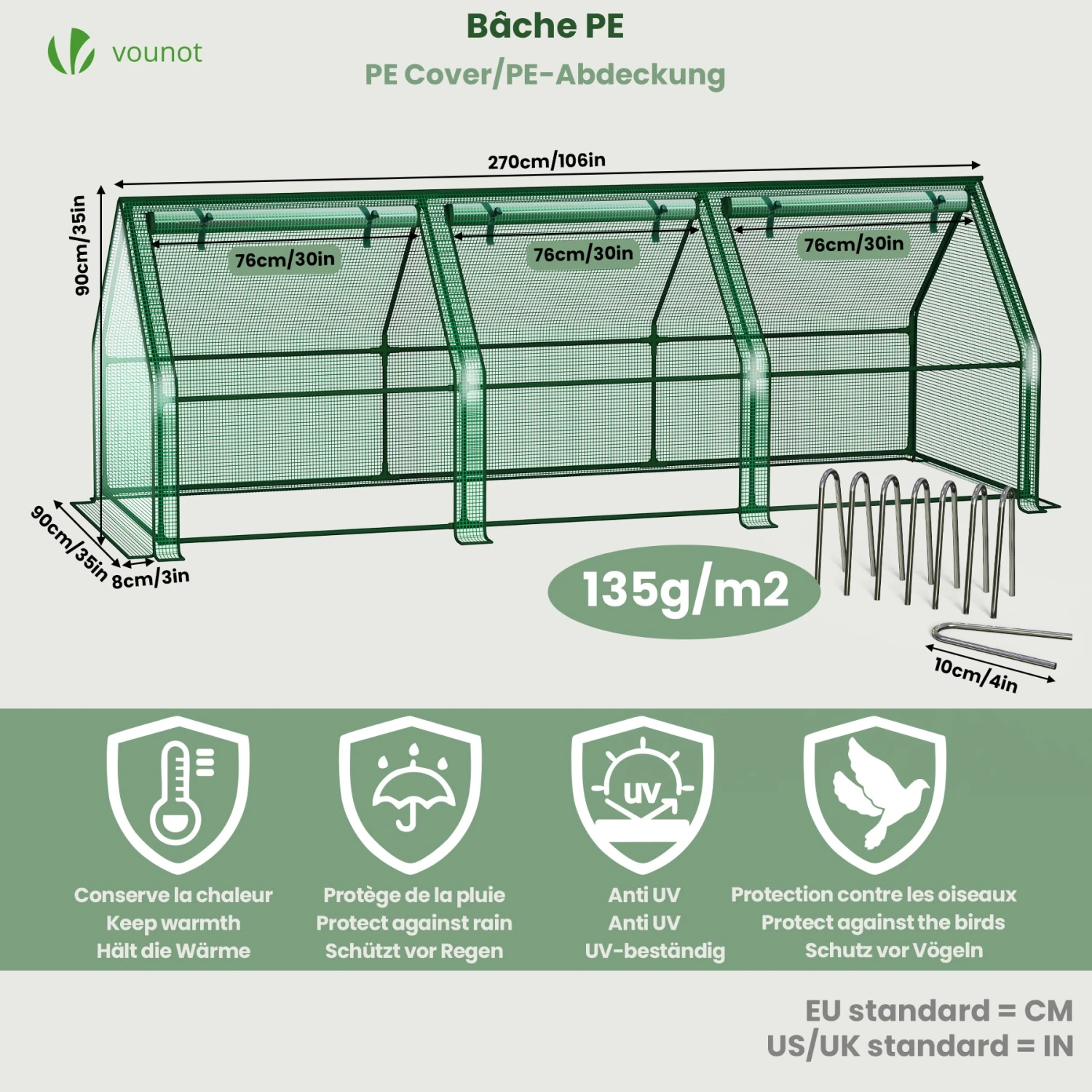 CARACTÉRISTIQUES • Dimensions totales : L.270 x l.90 x H.90 cm • Longueur de chaque fenêtre : 76 cm • Diamètre châssis tubulaire : 1.6 cm • Matériaux : Métal robuste, Polyéthylène haute densité de 135g/m² • Poids : 4 kg • Couleur : Vert • Contenu : 1*Kit de montage, 1*Bâche, 8*Piquets de fixation, 6*Attaches en nylon, 1*Notice d’instructions POURQUOI CHOISIR NOTRE MINI SERRE DE JARDIN ?