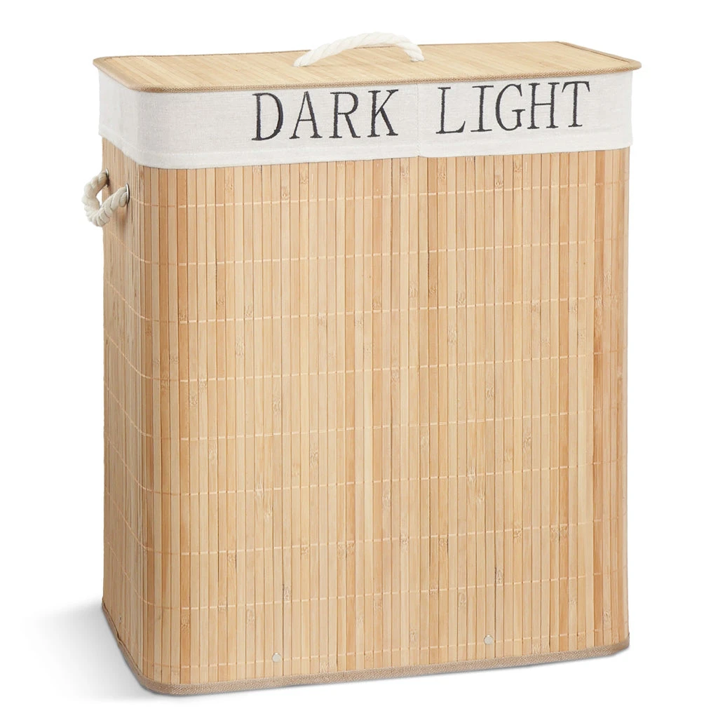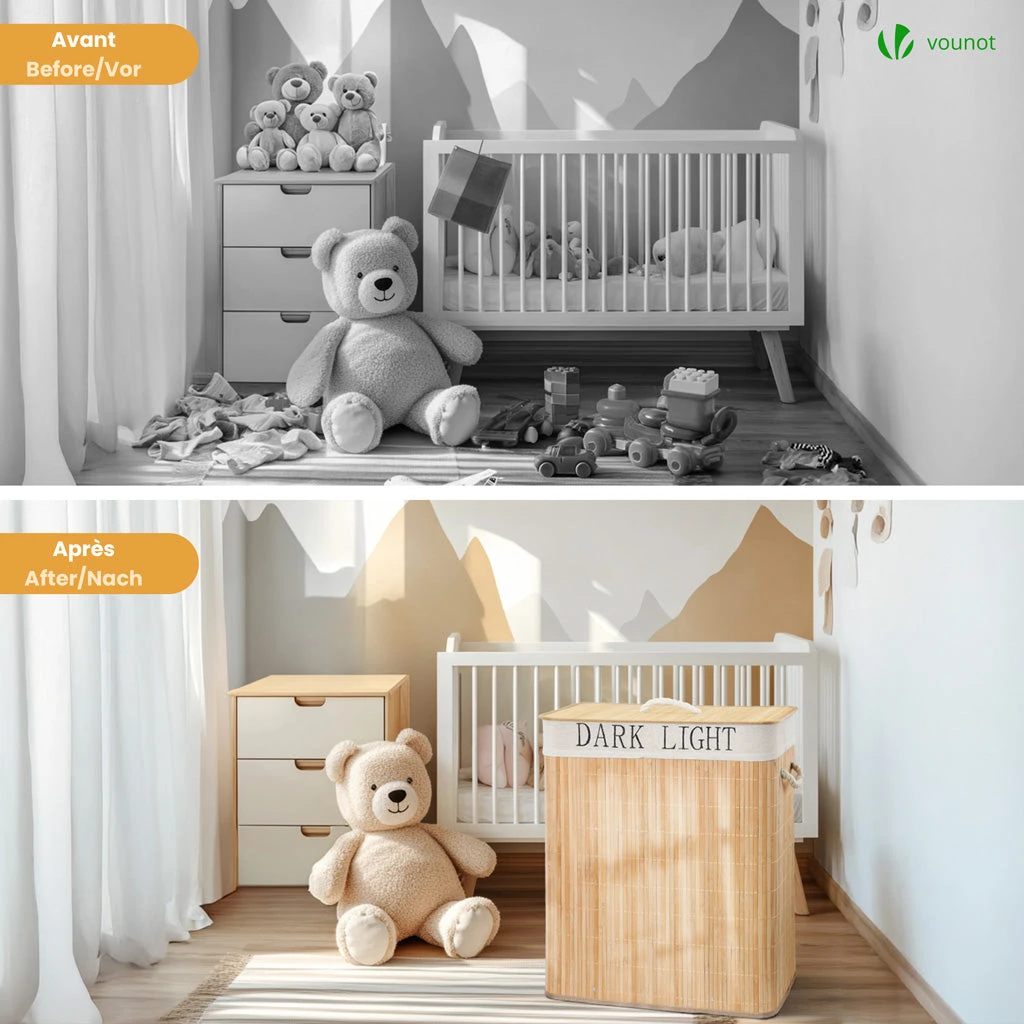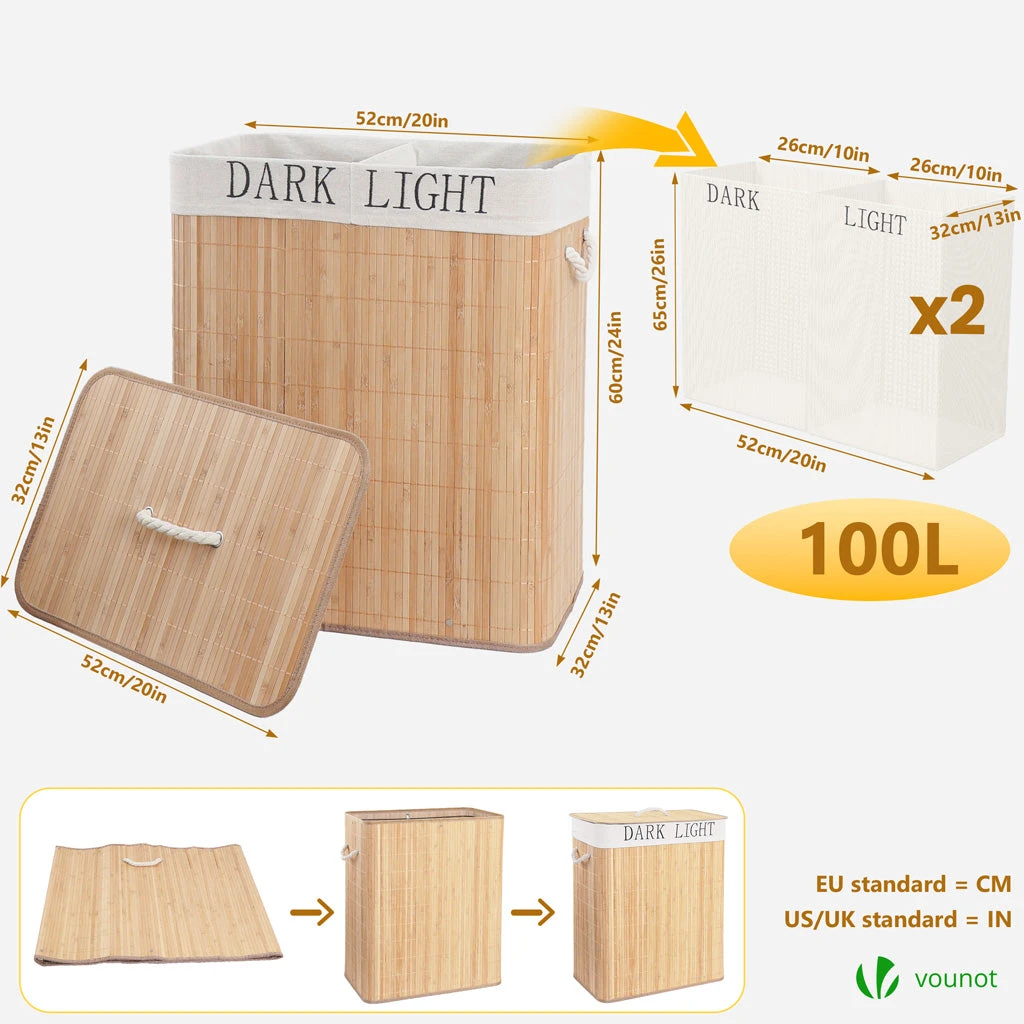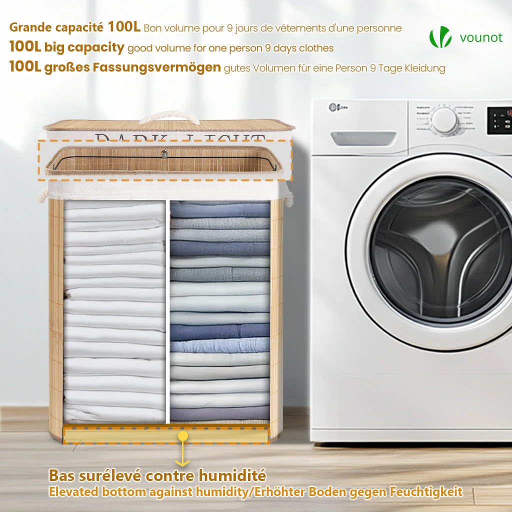 CARACTÉRISTIQUE • Taille du panier : 52x32x60cm • Taille du sac : 52x32x65cm • Capacité : 100L • Matériaux : Bambou, Tissu polyester-coton • Couleur : Bois Naturel • Poids : 2kg • Contenus : 1 Panier à linge, 2 Sacs intérieurs, 1 Notice Pour éviter tout risque de dommage ou de blessure, ne placez pas d’objets pointus dans ce panier à linge en bambou, respectez la capacité maximale de 100L et conservez-le dans un environnement sec.