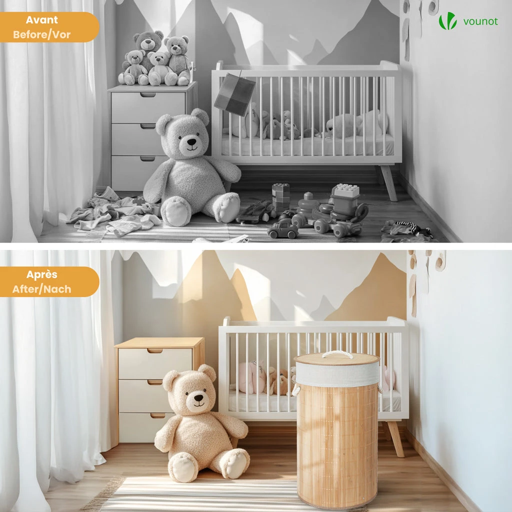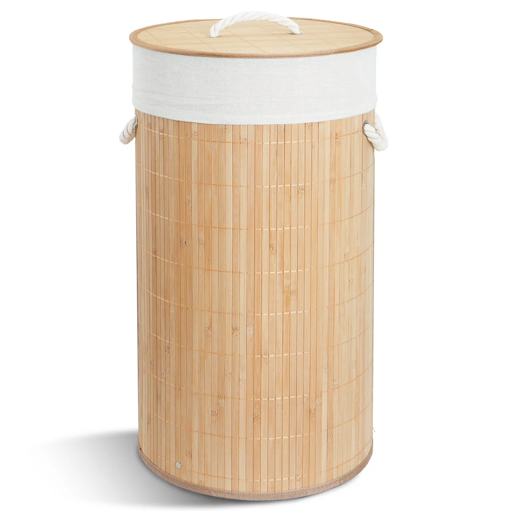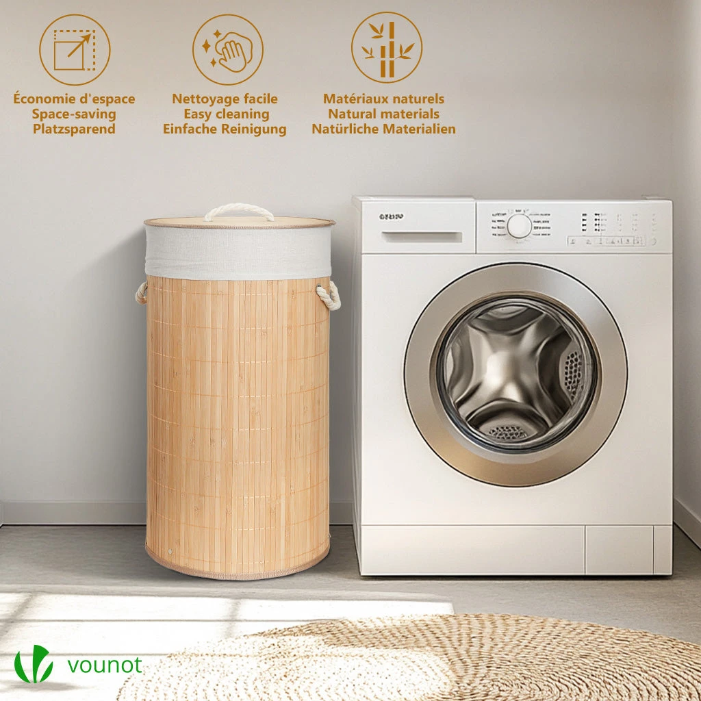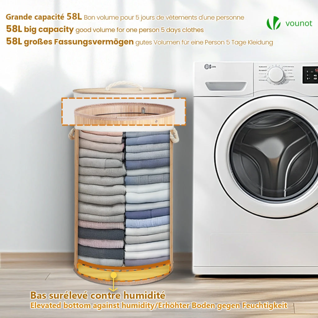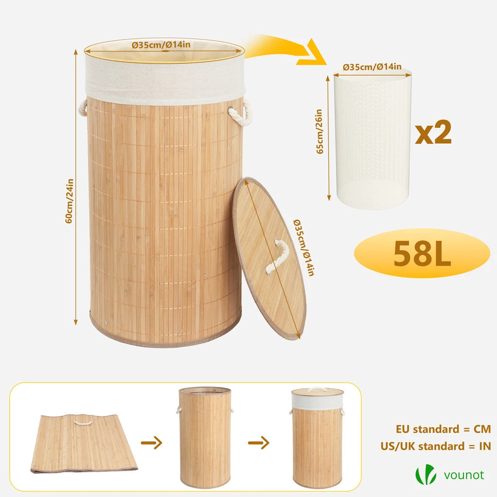 CARACTÉRISTIQUE • Taille du panier : Ø35x60cm • Taille du sac : Ø35x65cm • Capacité : 58L • Matériaux : Bambou, Tissu polyester-coton • Couleur : Bois Naturel • Poids : 1.2kg • Contenus : 1 Panier à linge, 2 Sacs intérieurs, 1 Notice Pour éviter tout risque de dommage ou de blessure, ne placez pas d’objets pointus dans ce panier à linge en bambou, respectez la capacité maximale de 58L et conservez-le dans un environnement sec.