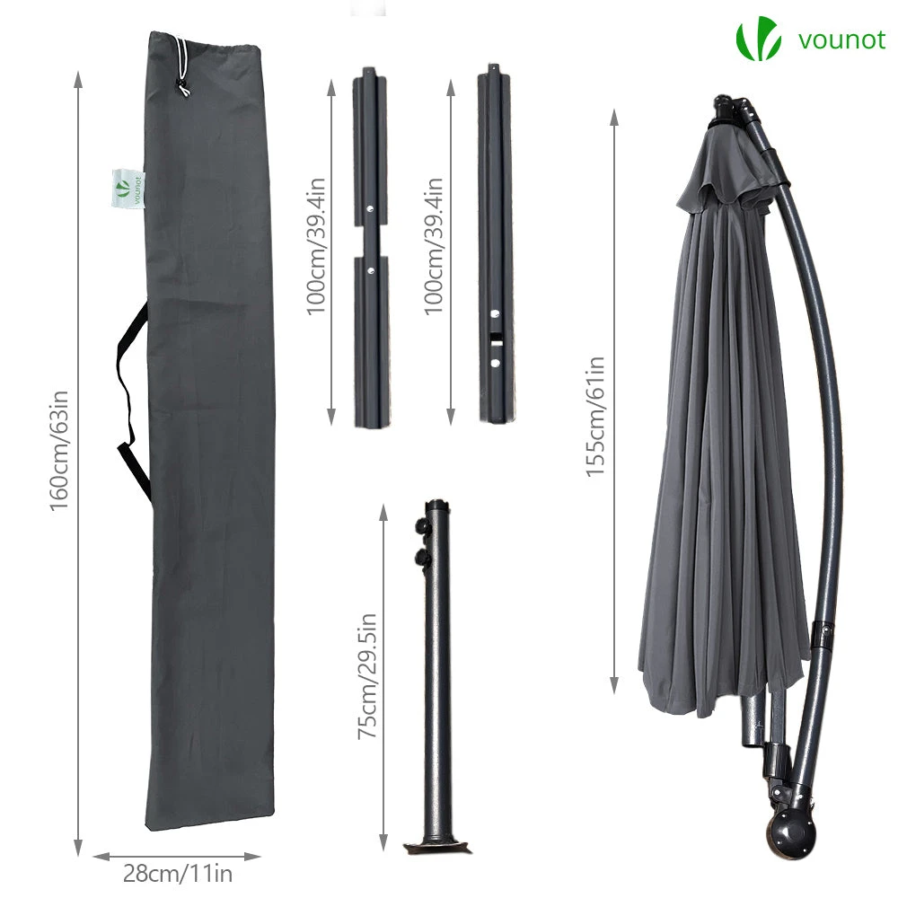 Parasol inclinable 2.70 x 2.40m avec housse de protection Couleur : Gris, Beige, Rouge Matière : acier, polyester Diamètre de la Toile : 2.7m Hauteur : 2.4m |