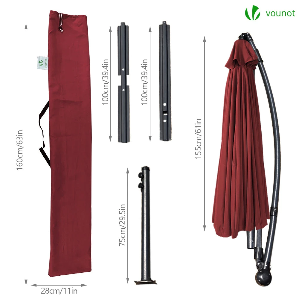 Parasol inclinable 2.70 x 2.40m avec housse de protection Couleur : Gris, Beige, Rouge Matière : acier, polyester Diamètre de la Toile : 2.7m Hauteur : 2.4m |