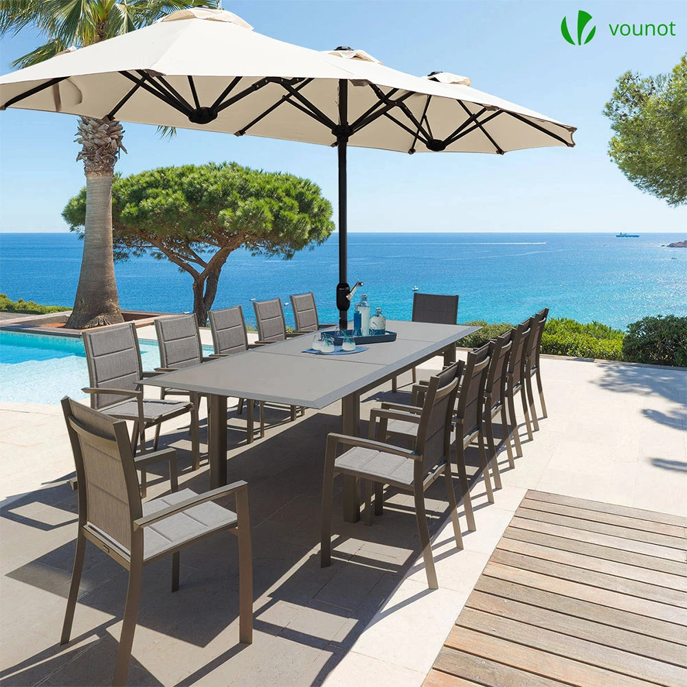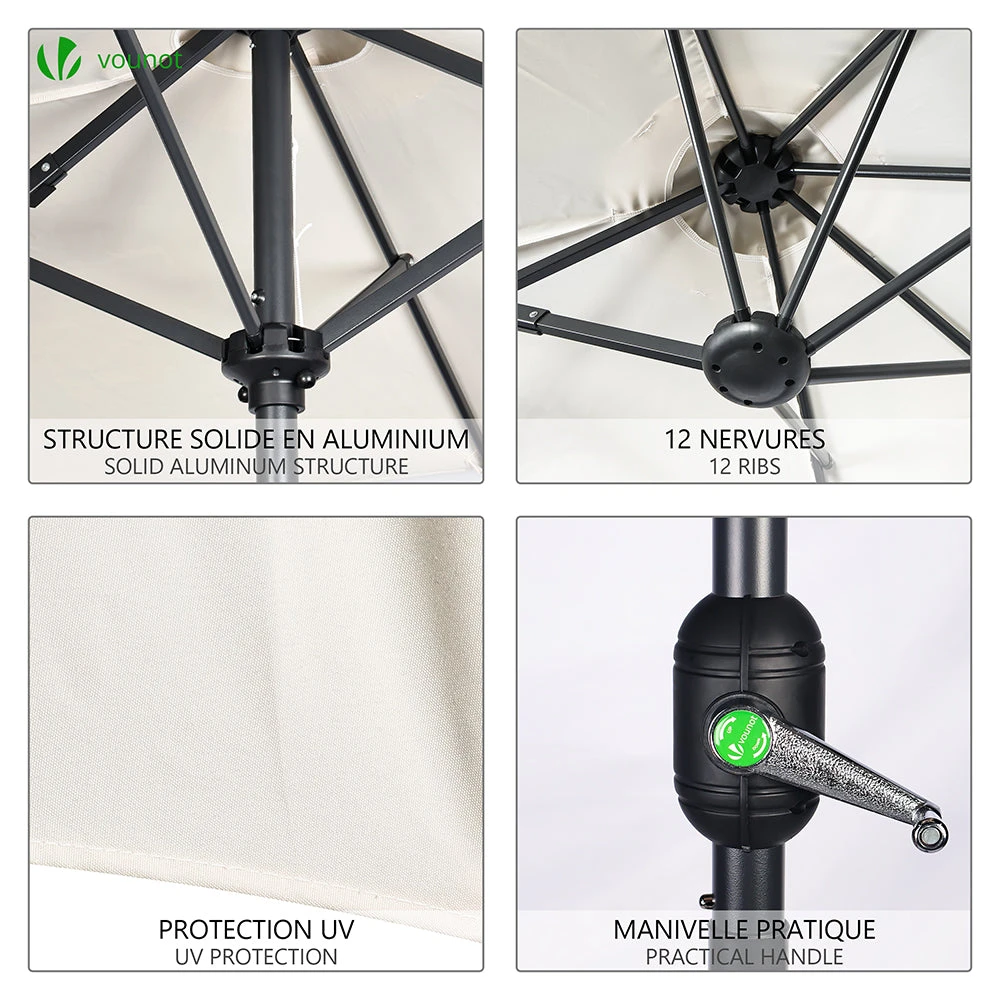 ATTENTION : Veuillez noter qu’il faut un support/dalle (non fournis) pour une meilleure stabilité. Les aventages de notre parasol double