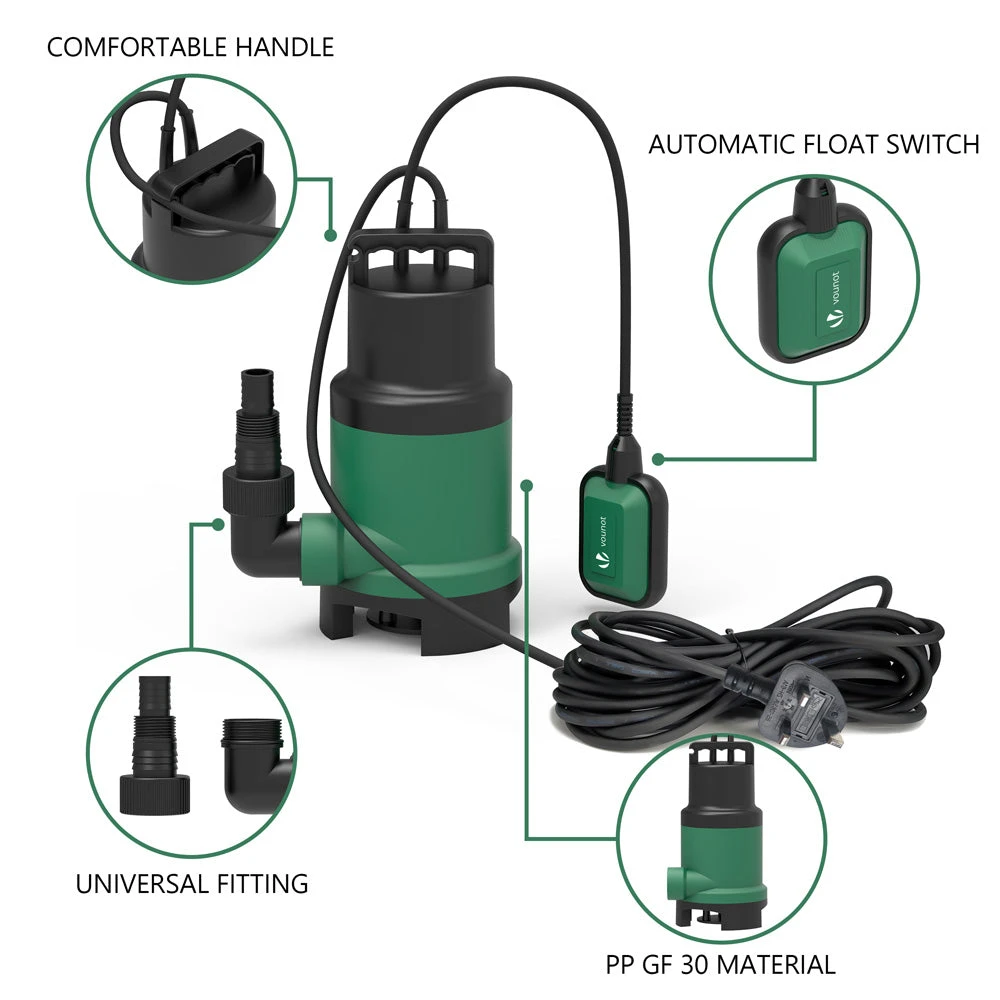 CARACTÉRISTIQUES – Capacité : Max.14000L/H – Profondeur d’immersion : 7M – Hauteur de Refoulement : 7.5M – Câble d’alimentation : 10M |