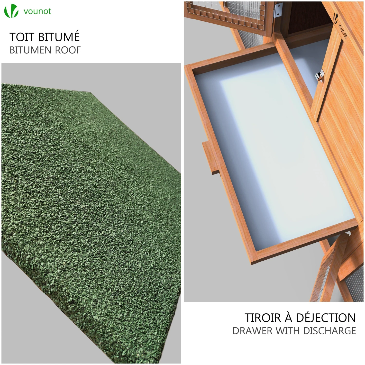POURQUOI CHOISIR NOTRE PRODUIT ? Poulailler idéal pour poules et Maison confortable pour lapins et petits animaux Notre poulailler se compose de trois parties. Deux espaces extérieurs cloisonnés, les poules peuvent se déplacer librement tout en restant dans le poulailler. Dans l’espace en haut, ils peuvent dormir paisiblement ou faire leurs besoins. Dans l’espace arrière, les poules peuvent y pondre des œufs tranquillement. Ce n’est pas seulement un poulailler mais cette maison en bois peut également accueillir des lapins et petits animaux. Le perchoir peut s’enlever et vous pouvez y rentrer plusieurs lapins et les placer dans les 3 compartiments pour un joli nid douillet.