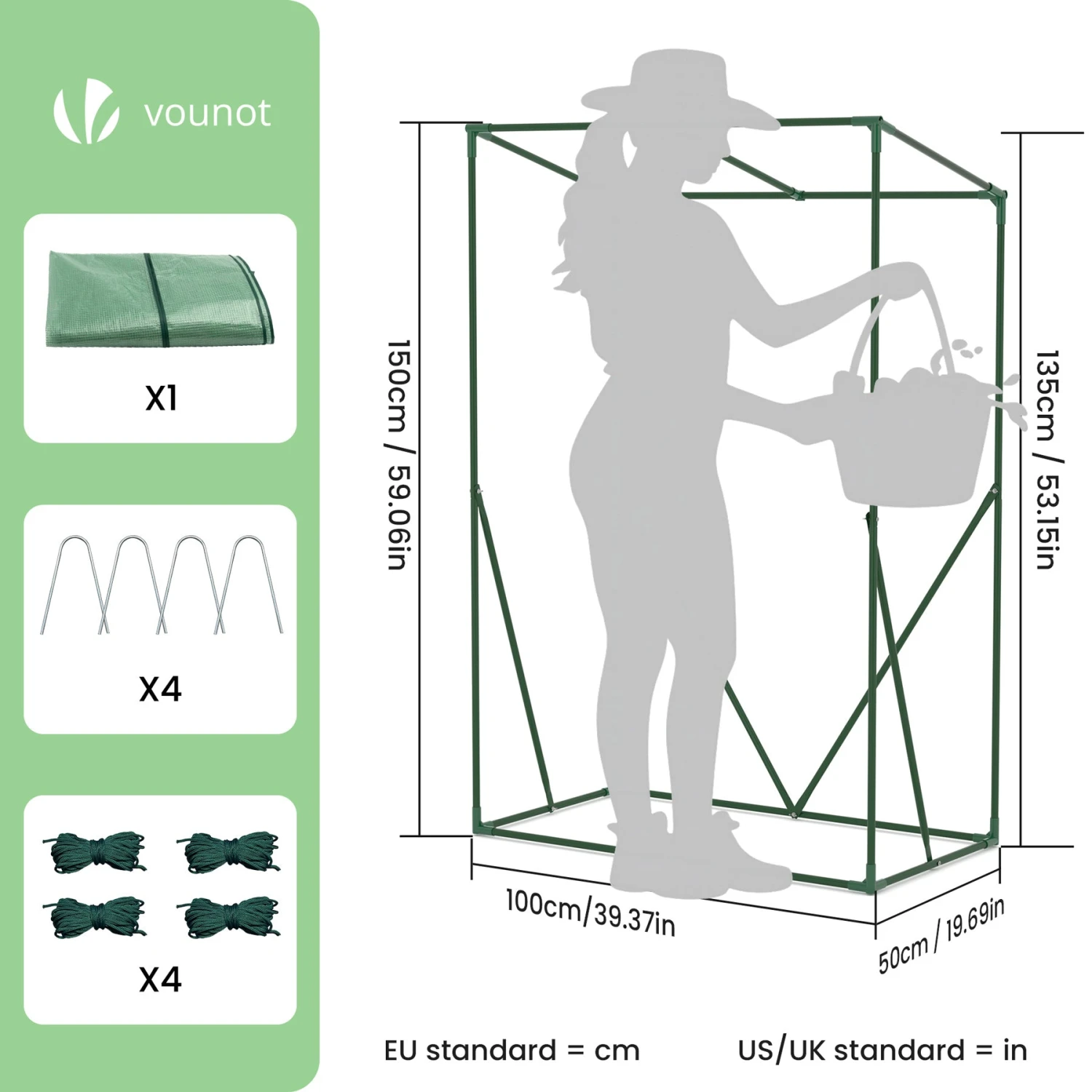 CARACTÉRISTIQUES • Dimensions totales : L.100 x l.50 x H.150 cm • Diamètre châssis tubulaire : 16 mm • Matériaux : Métal robuste, Polyéthylène haute densité de 135g/m² • Poids : 2.7 kg • Couleur : Vert • Contenu : 1*Kit de montage, 1*Bâche, 4*Piquets métalliques en U, 4*Cordes de fixation, 8*Attaches en nylon, 1*Notice d’instructions POURQUOI CHOISIR NOTRE SERRE DE JARDIN ?