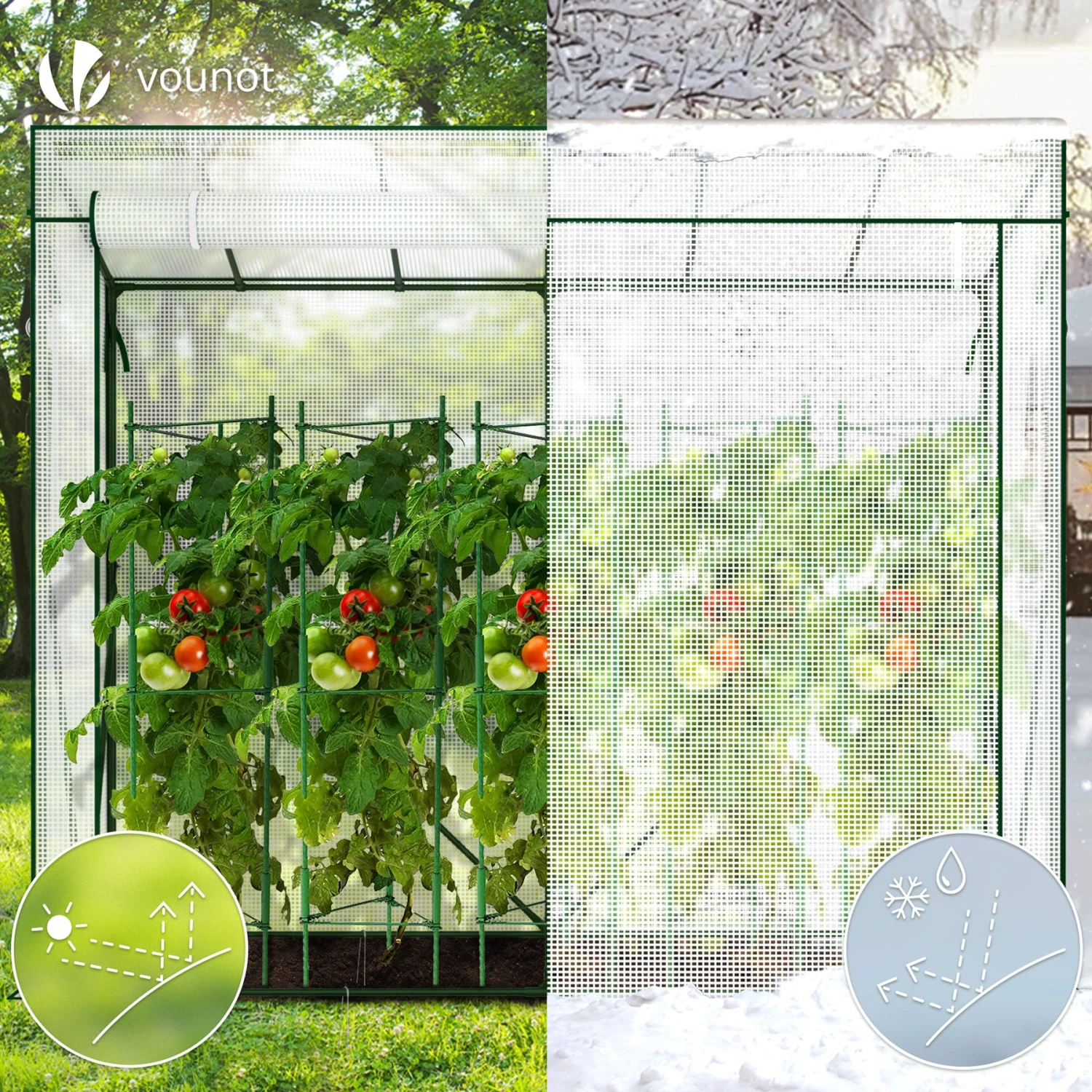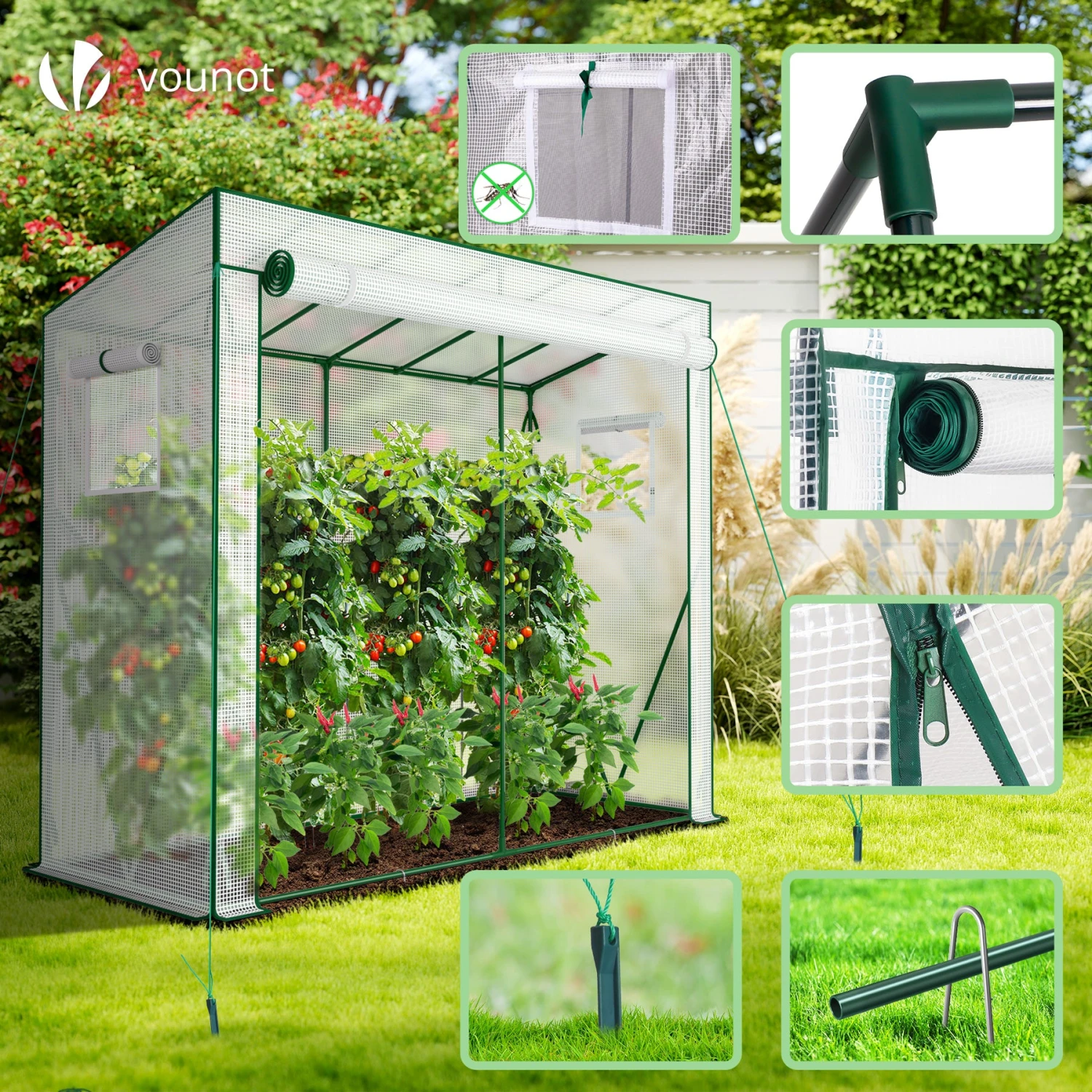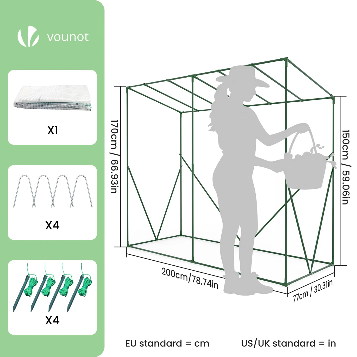 CARACTÉRISTIQUE • Dimensions totales : L. 200 x l. 77 x H. 170cm • Diamètre châssis tubulaire : 16 mm • Matériaux : Métal robuste ; Polyéthylène haute densité de 135g/m² • Poids : 5.5kg • Couleur : Blanc • Contenu : 1*Kit de montage, 1*Bâche, 4*Piquets métalliques en U, 4*Cordes avec sardines, 8*Attaches en nylon, 1*Notice d’instructions POURQUOI CHOISIR NOTRE SERRE DE JARDIN ?