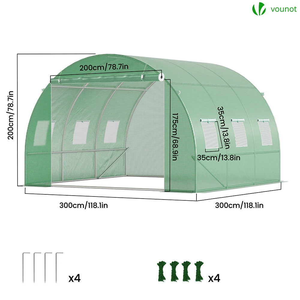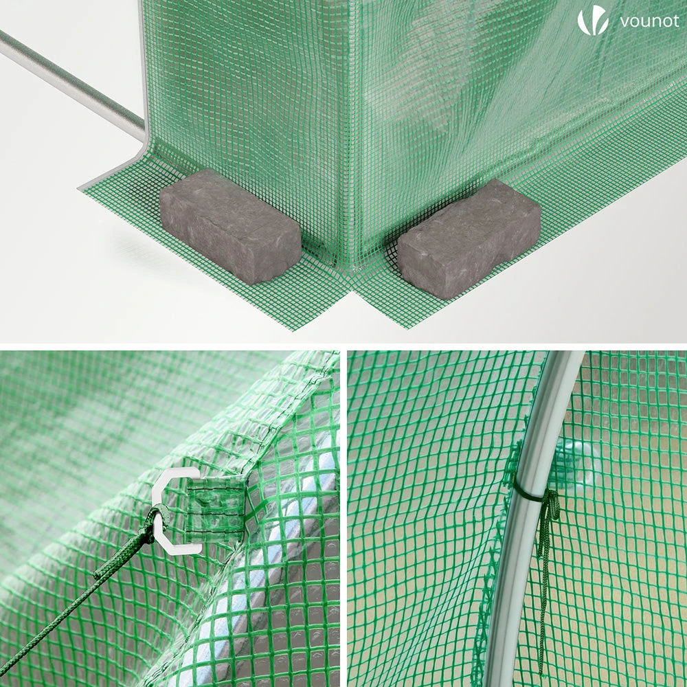 ATTENTION : Veuillez noter que les dommages causés par les conditions météorologiques et climatiques ne sont pas couverts par la garantie. Structure en Acier Galvanisée Avantages par rapport à la concurrence Notre serre avec beaucoup plus d’entretoises en acier que les modèles conventionnels. Notre serre de jardin maraîchère verte a une armature en acier galvanisée et est équipée de 2 barres anti-tempête pour une résistance forte. INFO IMPORTANTE : LA POSER SUR LE SOL NE SUFFIT PAS. Notre serre a une meilleure résistance au vent grâce au surplus de bâche à enterrer, mais ne signifie pas que la serre résiste à des vents moyens et forts. Il est donc vivement recommandé de retirer la bâche en cas de vents. Sinon il est également conseillé d’enterrer la structure métallique au sol ou renforcer le maintien au sol. 6 Fenêtres Latérales