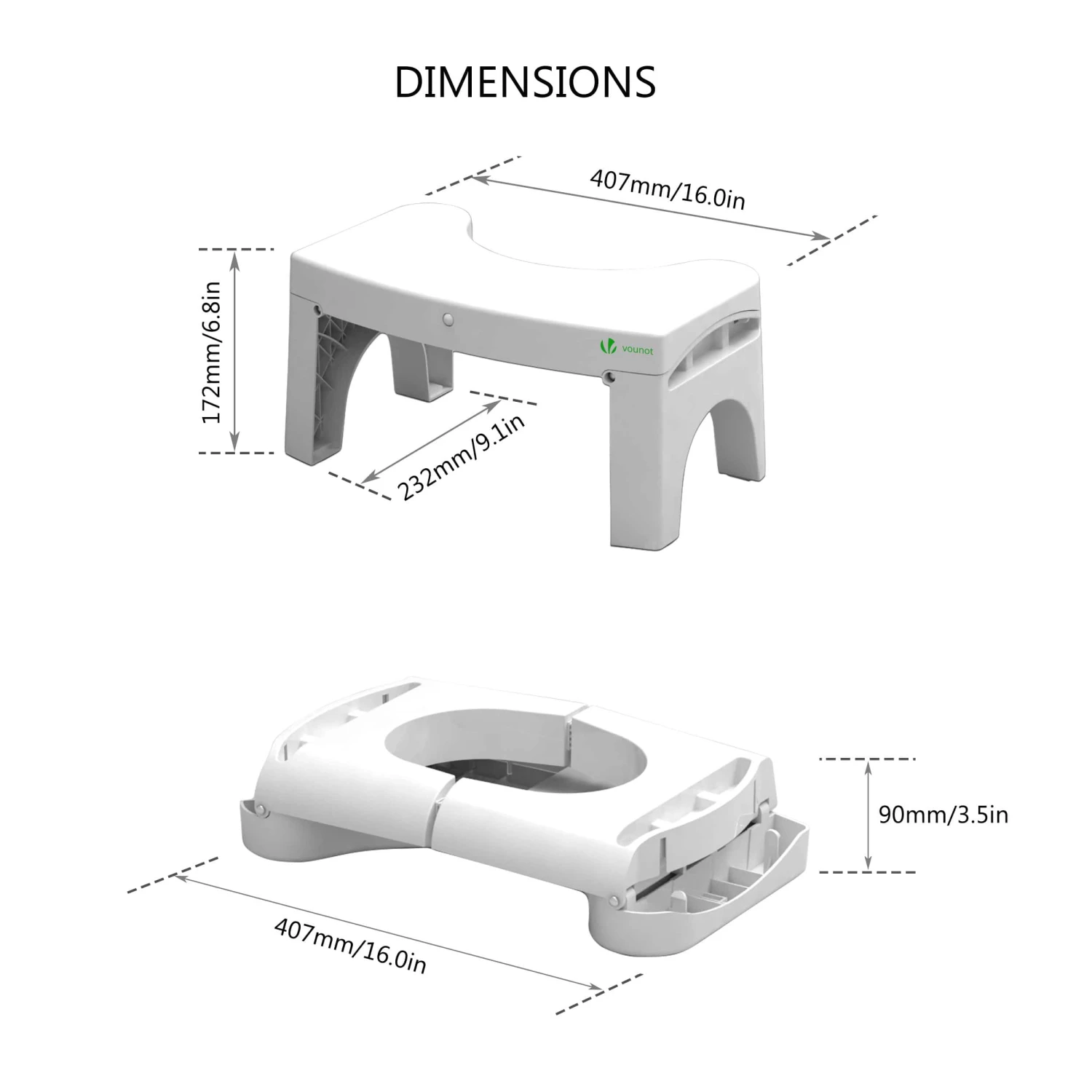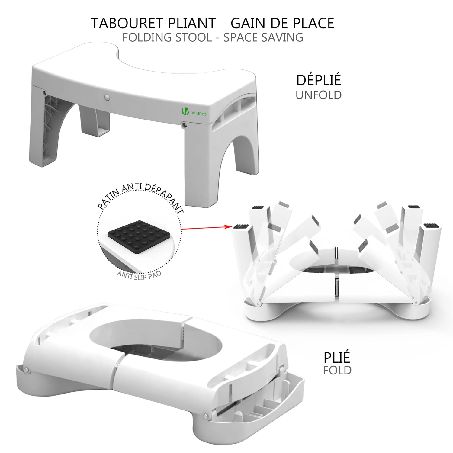 - Notre tabouret de toilettes est pliable et peut donc être rangé à côté de vos toilettes.