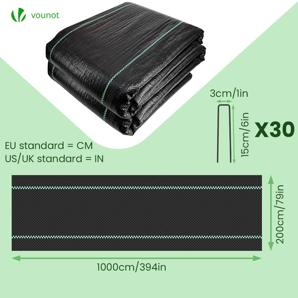 | Toile de paillage 2x10m | Toile de paillage 2x10m avec 30 piquets | Toile de paillage 2x25m | Toile de paillage 2x25m avec 50 piquets |