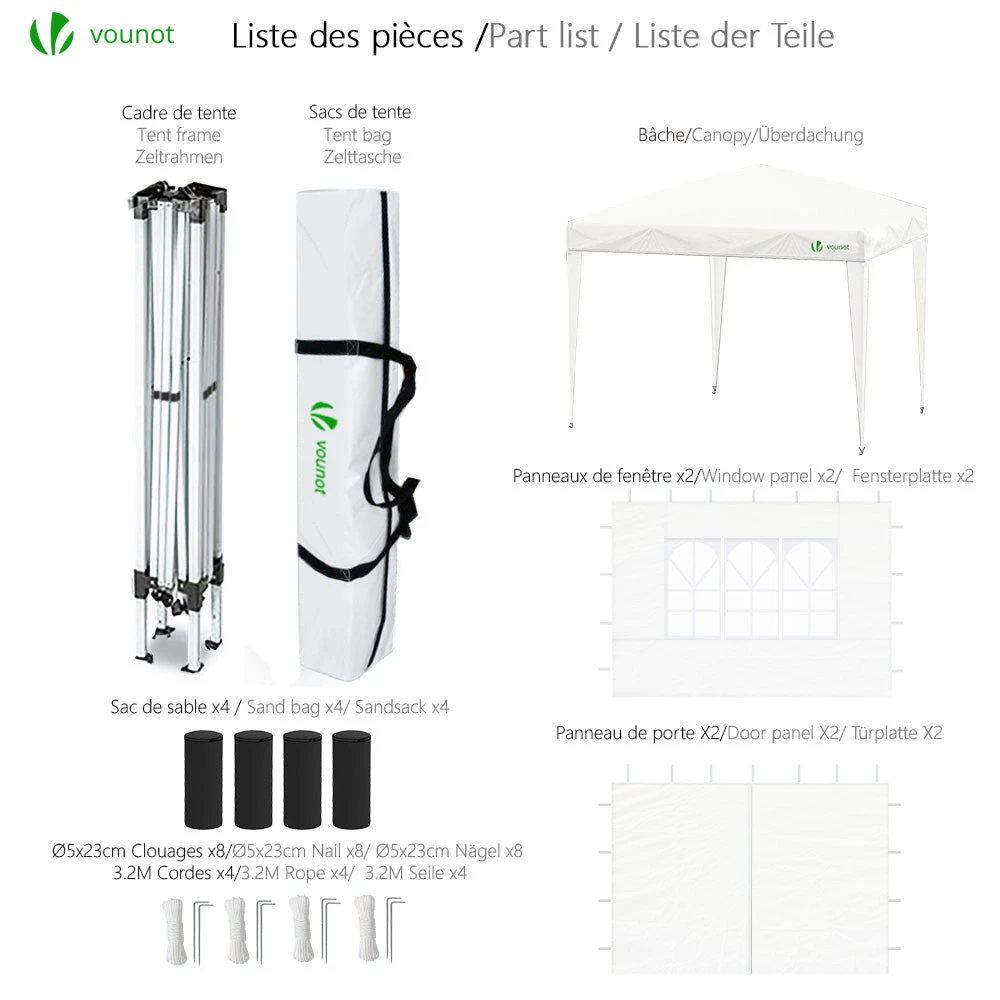 Tonnelle de jardin 3x3m POP UP avec parois Couleur : Gris, Blanc, Vert, Bleu Matière : Acier, Polyester Poids : 17.8kg |