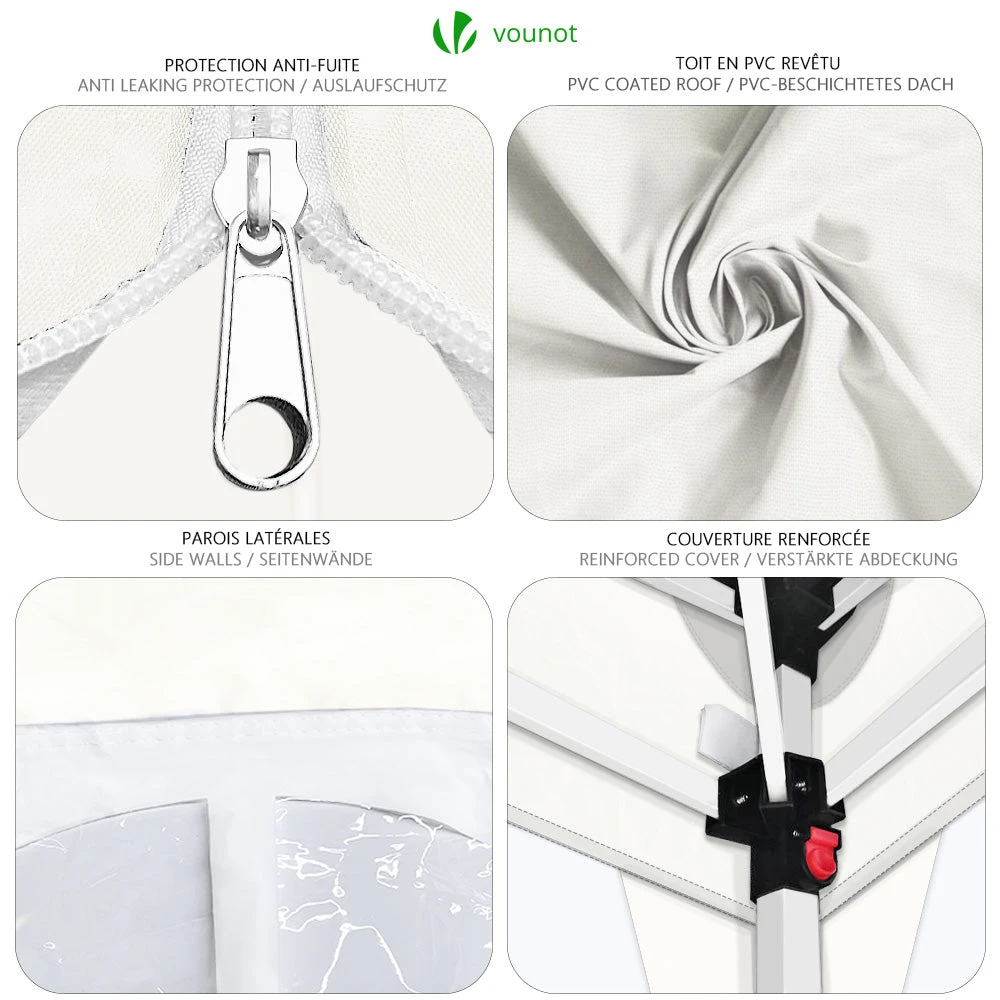Tonnelle de jardin 3x3m pliable avec parois Couleur : Gris, Blanc, Vert, Bleu Matière : Acier, Polyester, PVC Poids : 15kg |