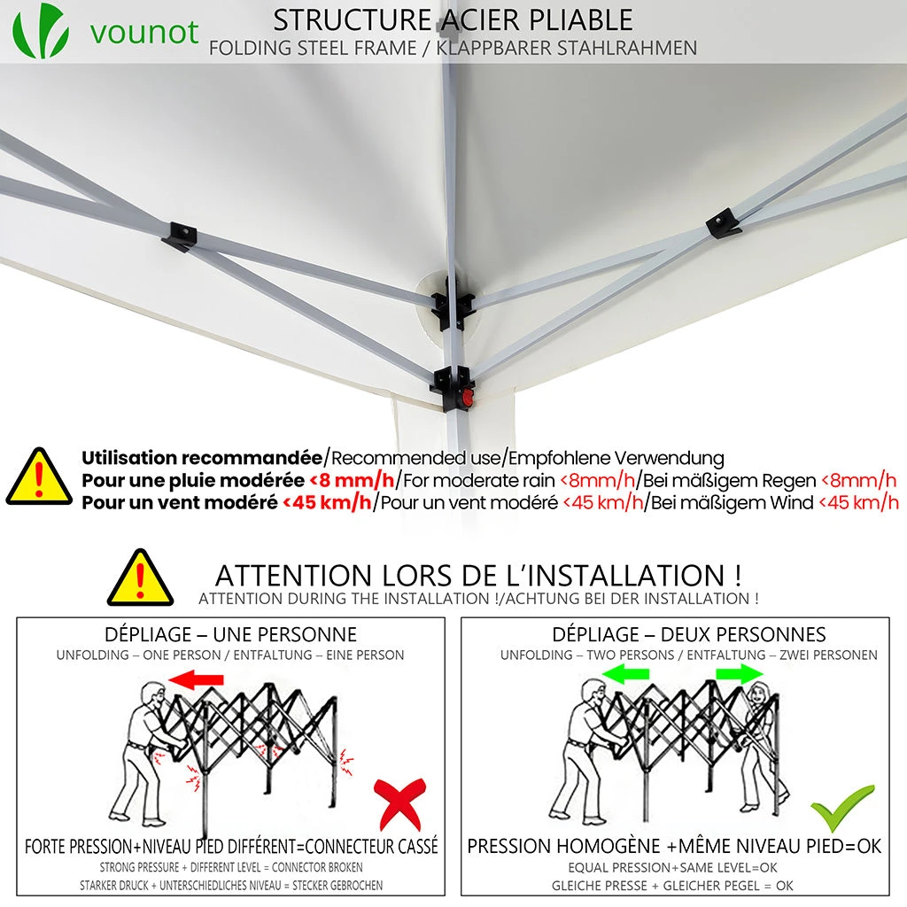 RAPPEL Merci de bien faire le montage de la tonnelle à 2 surtout au dépliage. Un mauvais dépliage peut entraîner une cassure au niveau des connecteurs. Merci de vous assurer au moment du dépliage que le niveau des pieds est identique. CONSEIL D’USAGE