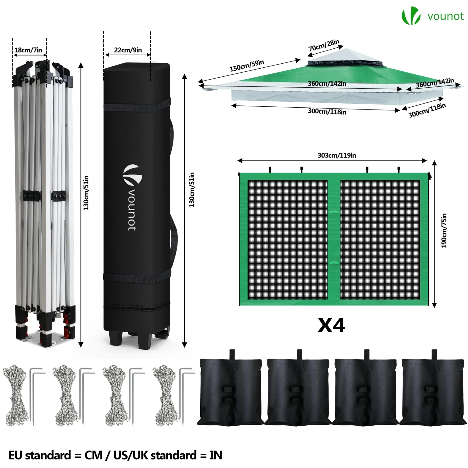 Tonnelle de jardin 3.6×3.6m pliable avec moustiquaire Couleur : Beige, Gris, Vert Matière : Acier, Polyester Poids : 18.7kg |