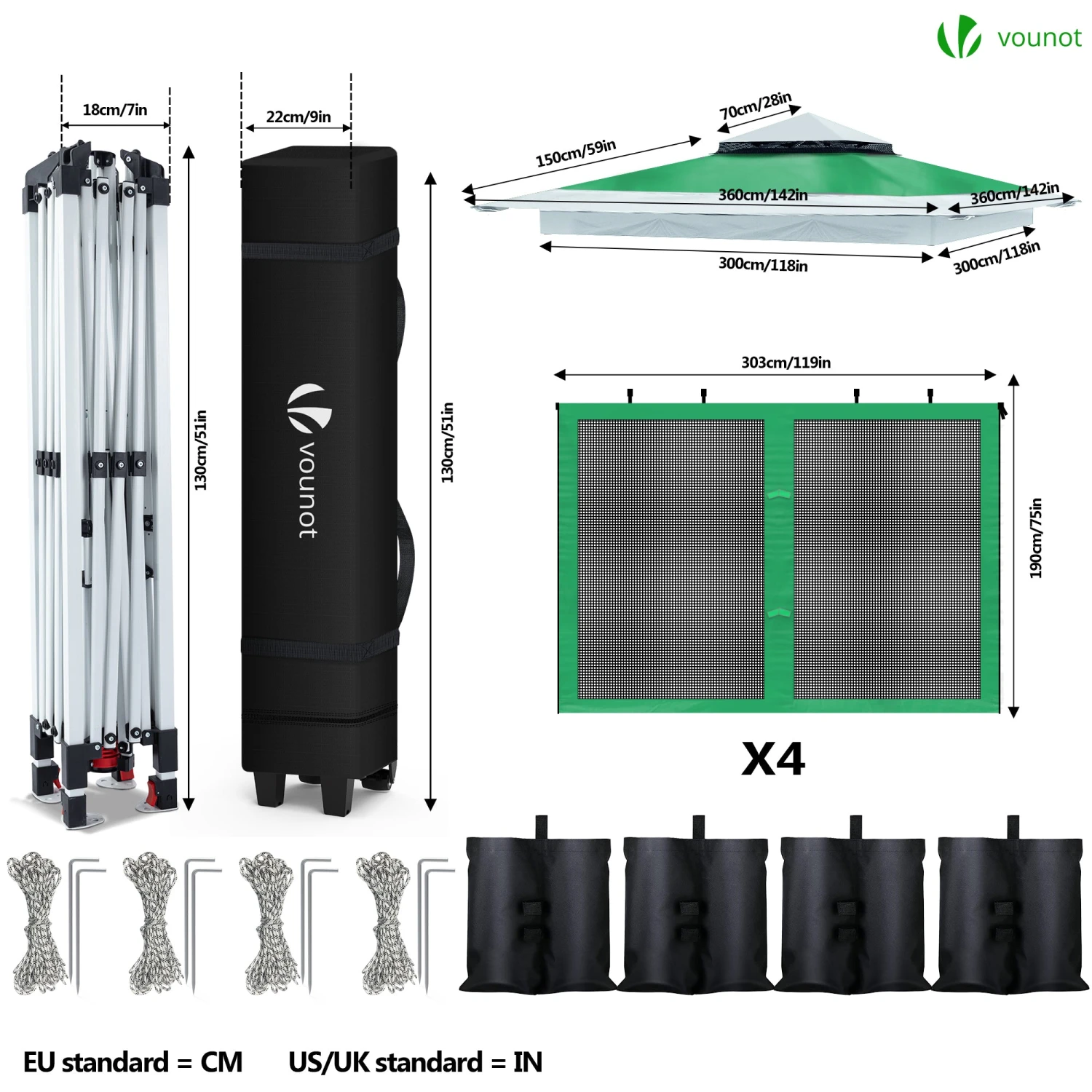 Tonnelle de jardin 3.6×3.6m pliable avec moustiquaire Couleur : Beige, Gris, Vert Matière : Acier, Polyester Poids : 18.7kg |