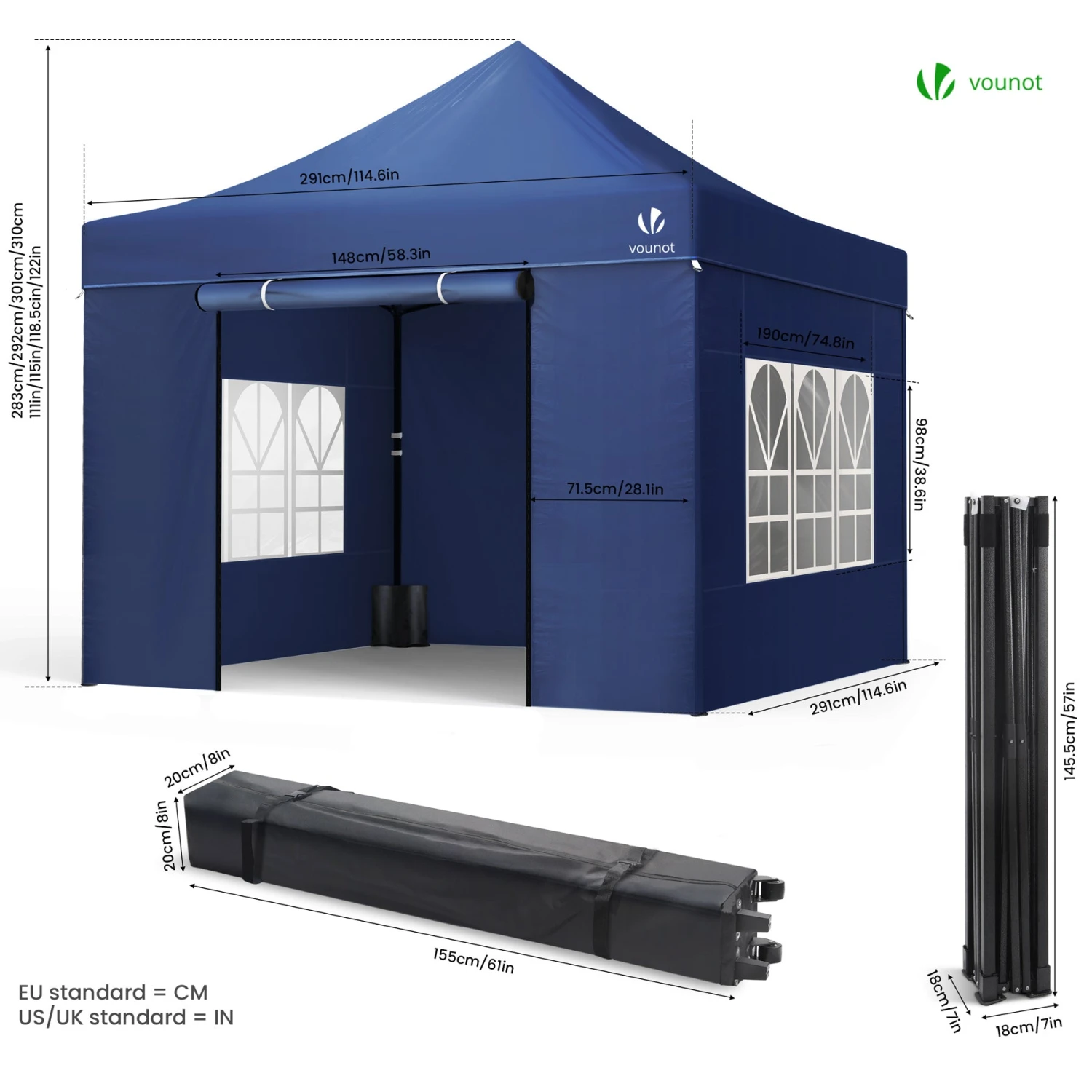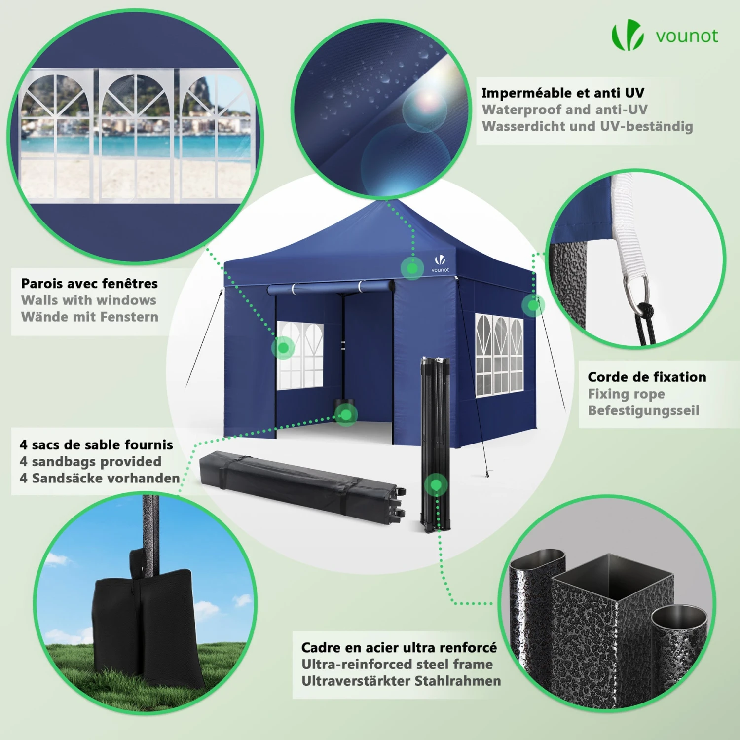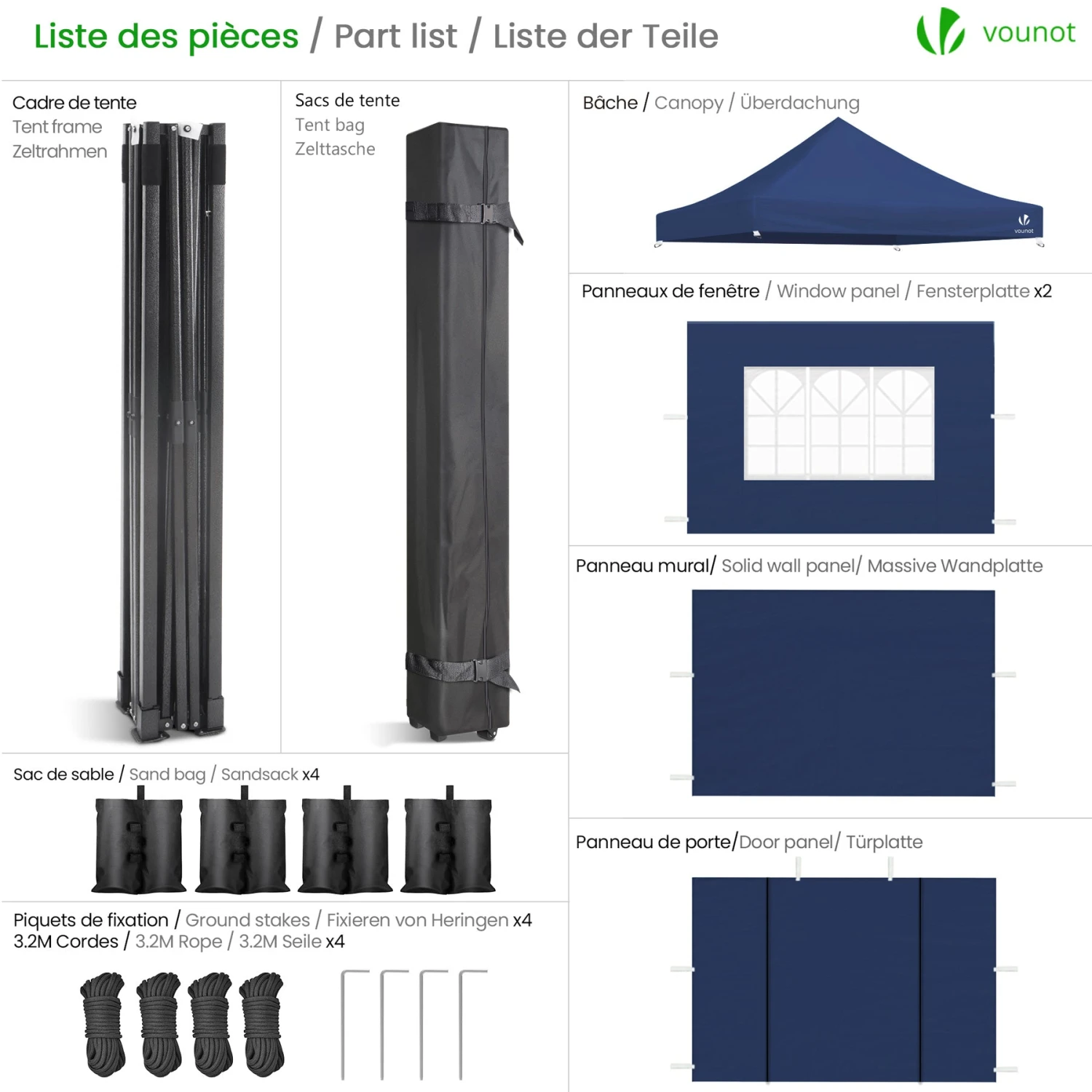 Tonnelle de jardin 3x3m POP UP avec parois Couleur : Gris, Blanc, Vert, Bleu Matière : Acier, Polyester Poids : 17.8kg |