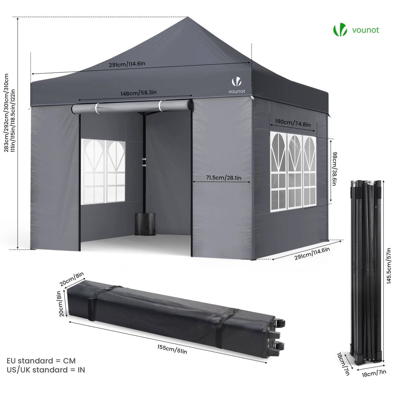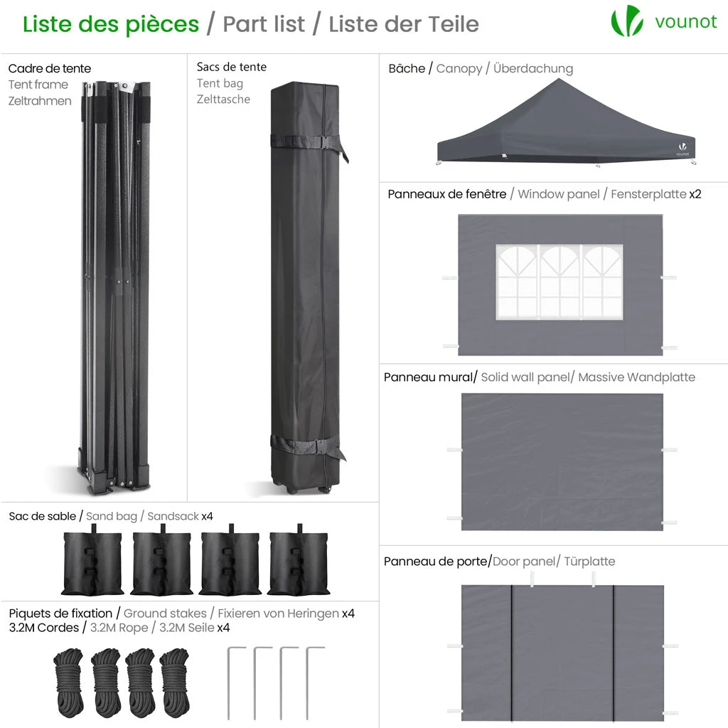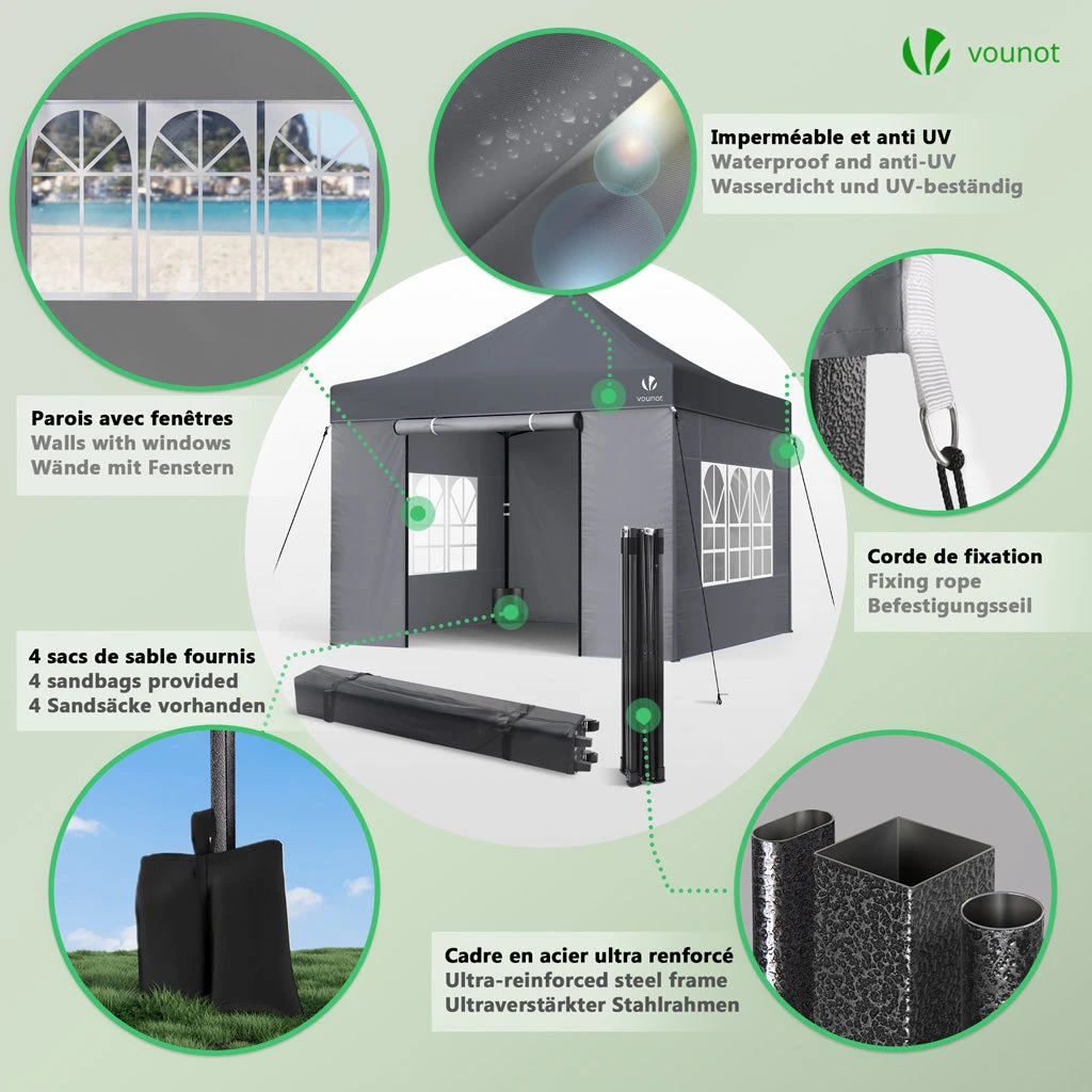 Tonnelle de jardin 3x3m POP UP avec parois Couleur : Gris, Blanc, Vert, Bleu Matière : Acier, Polyester Poids : 17.8kg |