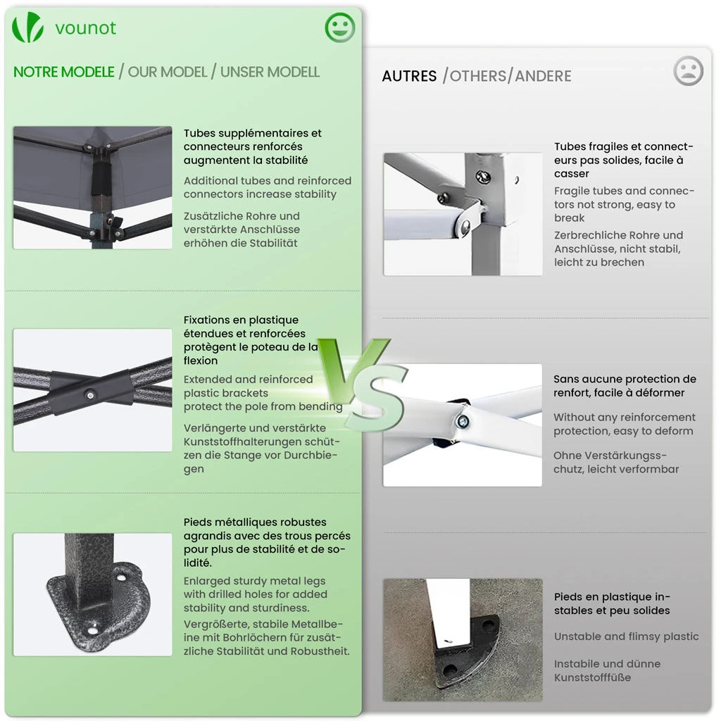 Tonnelle de jardin renforcée 3x3m pliable avec parois Couleur : Gris, Blanc, Vert, Bleu Matière : Acier inox, Polyester, PVC Poids : 24.5kg |