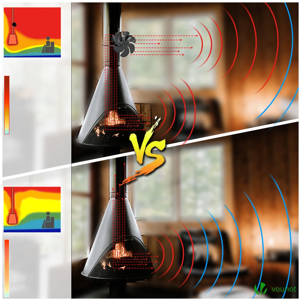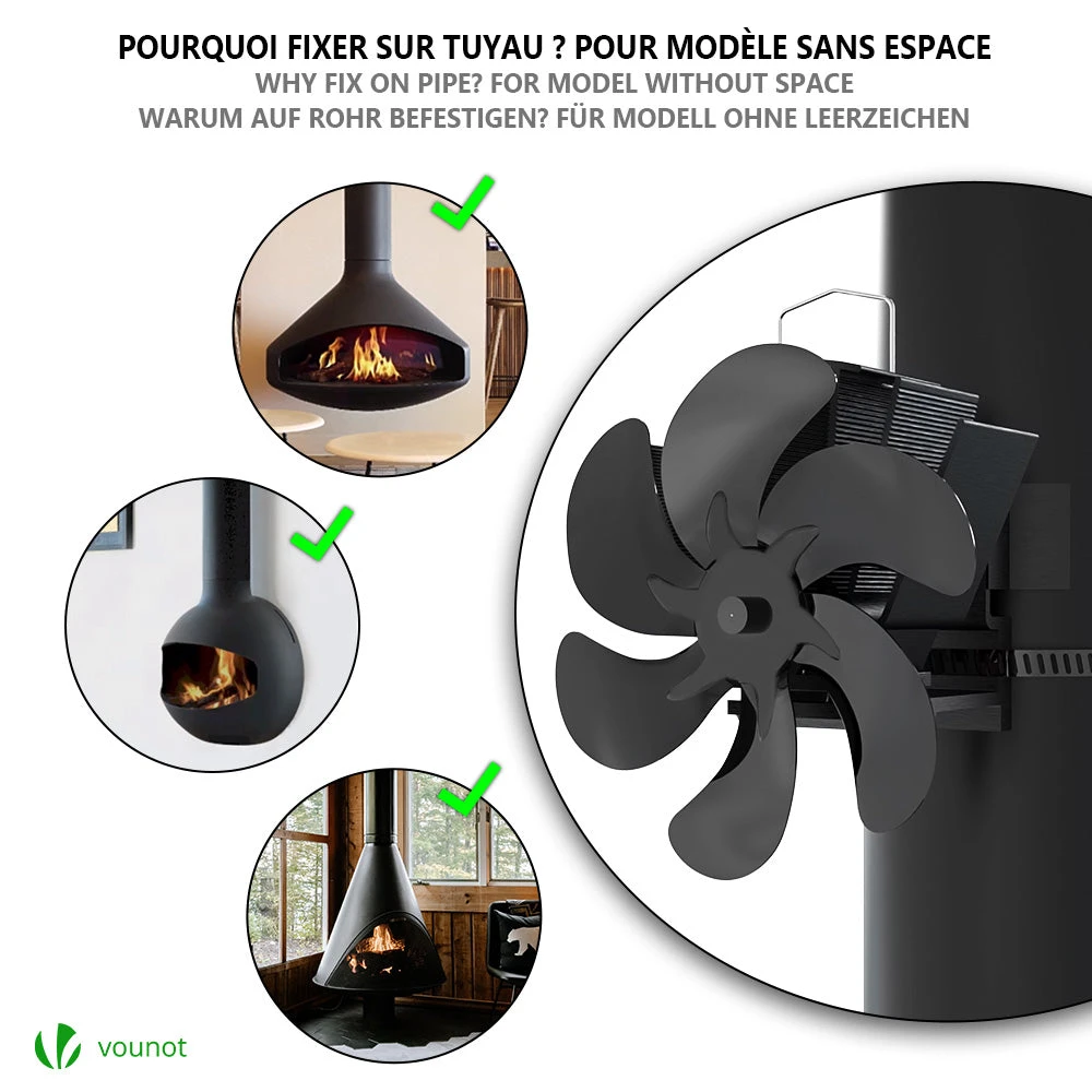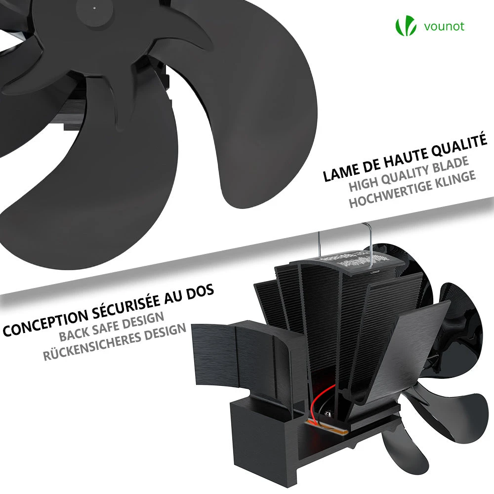 COMMENT CE VENTILATEUR CHEMINÉE FONCTIONNE? Ce ventilateur de poêle alimenté par la chaleur ne nécessite ni piles ni électricité et est conçu pour faire circuler l’air chaud produit par le bois/charbon ou les granulés.